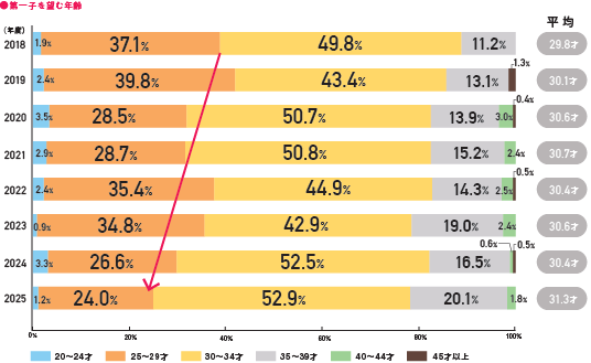 ●将来、子どもを望む若年未婚男女の第一子希望年齢に関して、2018年は約2.5人に1人(39.0%)が30歳になるまでに第一子を望んでいましたが、2025年は約4人に1人(25.2%)まで減少。30代以降に希望する層が伸張しており、第一子希望年齢は後ろ倒しとなっています。(平均年齢は31.3才)