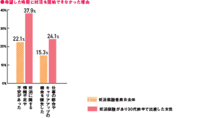 希望より遅くなったと回答。30代女性は、4割以上が希望していた時期に妊活ができなかった。