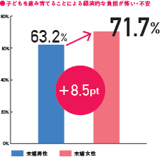 ●若年未婚男女において、「結婚・出産・子育てや生活・人生に対する意識」に対して、男性よりも女性が、子どもを産み・育てることによる「経済的な負担」と「仕事のキャリアへの支障」をより不安視しています。その差は、女性がおよそ10pt高い結果に。