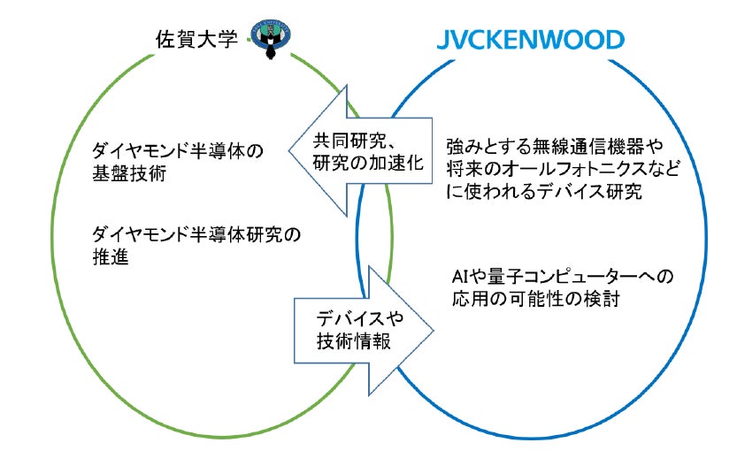 佐賀大学は、JVCケンウッドからダイヤモンド半導体研究への共同研究契約を通じた支援を受け、本研究を促進すると共に、JVCケンウッドへ主にマイクロ波帯、ミリ波帯通信用半導体の技術情報を提供します。