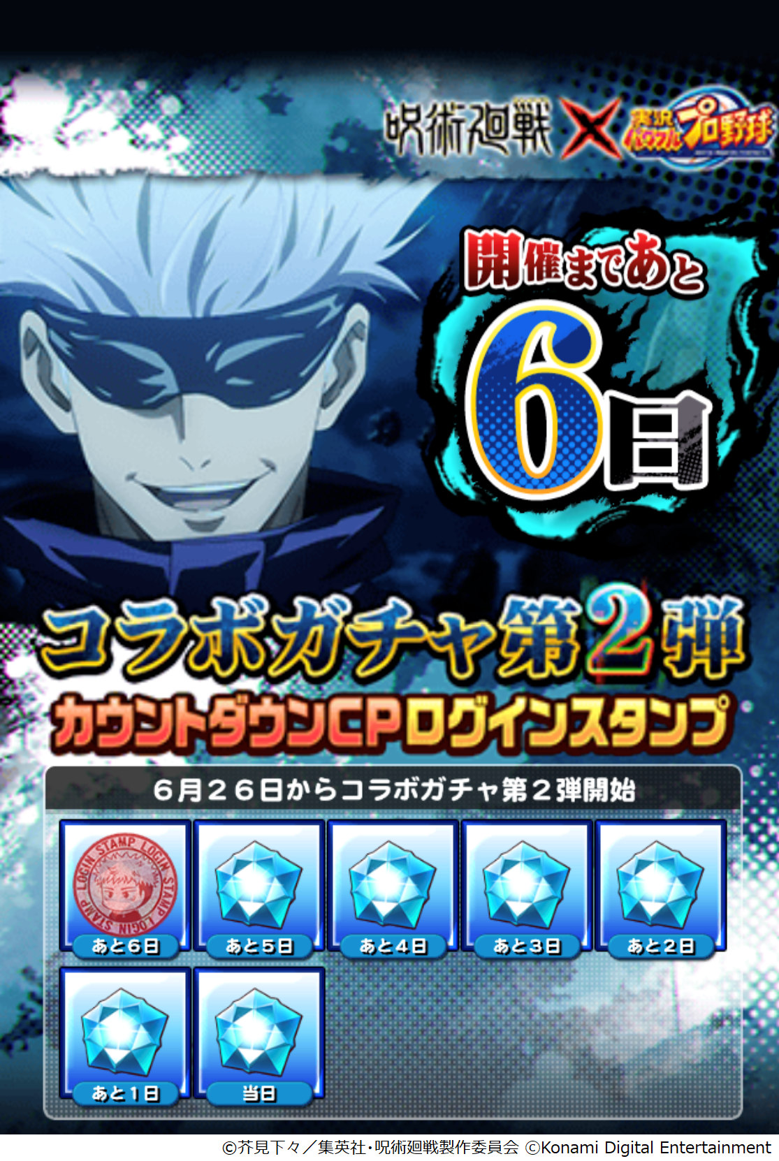 株式会社コナミデジタルエンタテインメントは、モバイルゲーム『実況パワフルプロ野球』(以下、『パワプロアプリ』)とテレビアニメ「呪術廻戦」で実施中の“特級コラボ”において、五条 悟が登場するコラボガチャ第2弾が6月26日(日)にスタートすることをお知らせします。