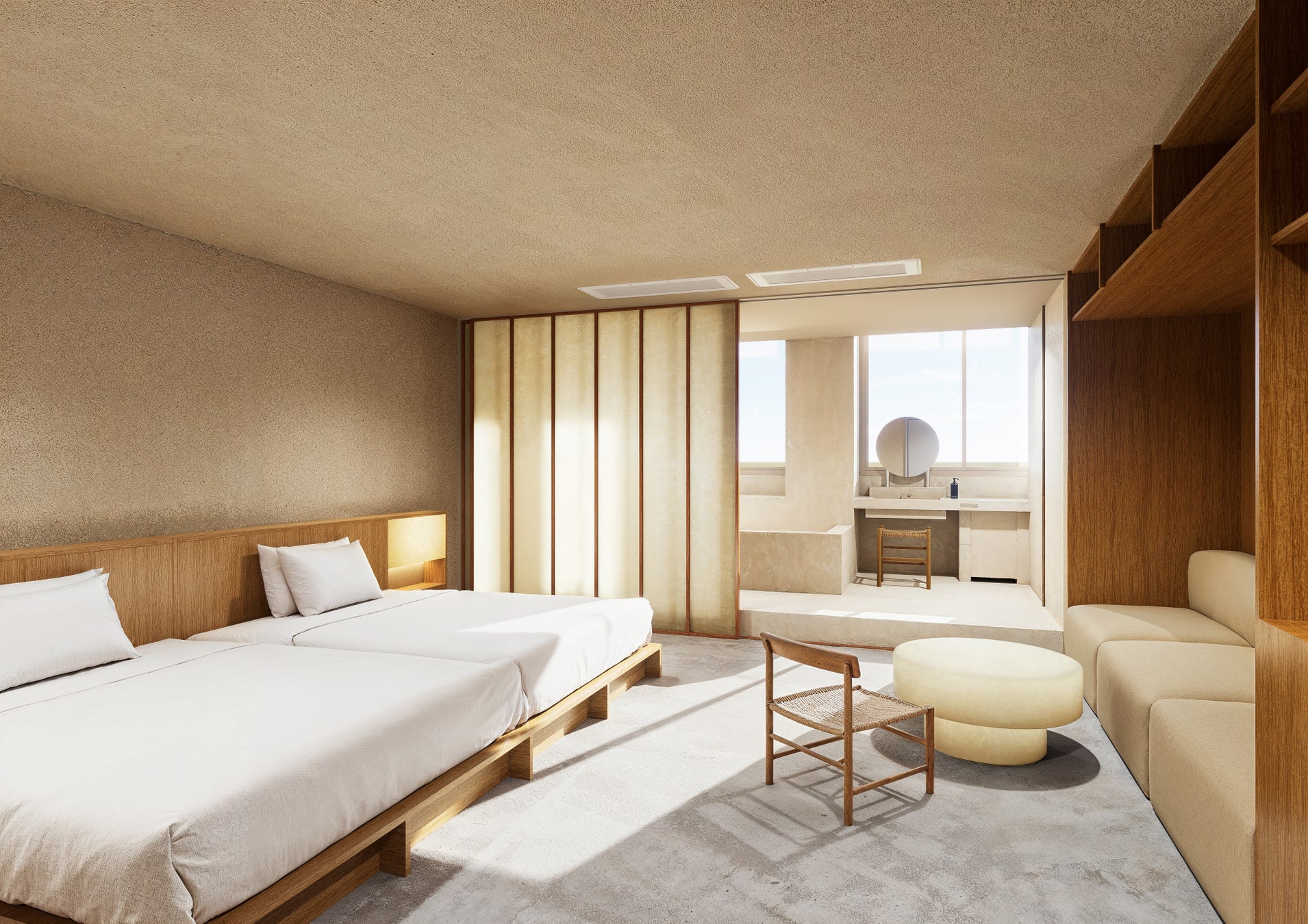 好みの異なる旅行者同士が、「島泊」をきっかけにゆるやかな交流を育めるよう、デザインの異なる客室をご用意しました。長期滞在を含むさまざまな旅の過ごし方に対応できるよう、広さやタイプに幅を持たせています。お客さま一人ひとりの感覚にあった心地よさをお選びいただけます。