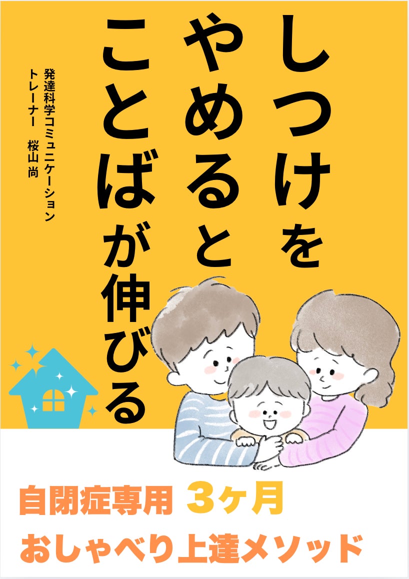 はじめまして 発達科学コミュニケーショントレーナー桜山尚です。ことばの苦手な自閉症児がママとの愛着をもっと深めてことばが伸びるようサポートする専門家として活動しています。この度は、しつけをやめるとことばが伸びる 自閉症専用3ヶ月 おしゃべり上達メソッド 電子書籍をリリースいたしました。
