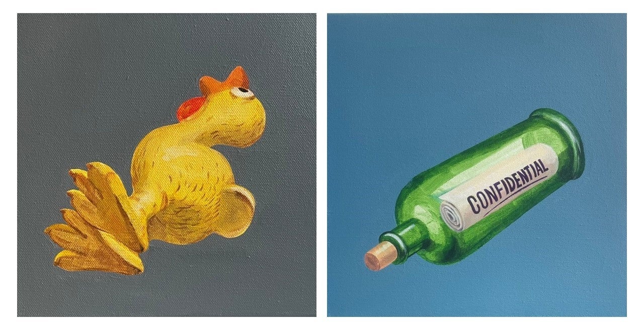 ▲≪Duck≫ 200×200, acrylic on canvas、≪Confidential(機密文書)≫ 300×300, acrylic on canvas