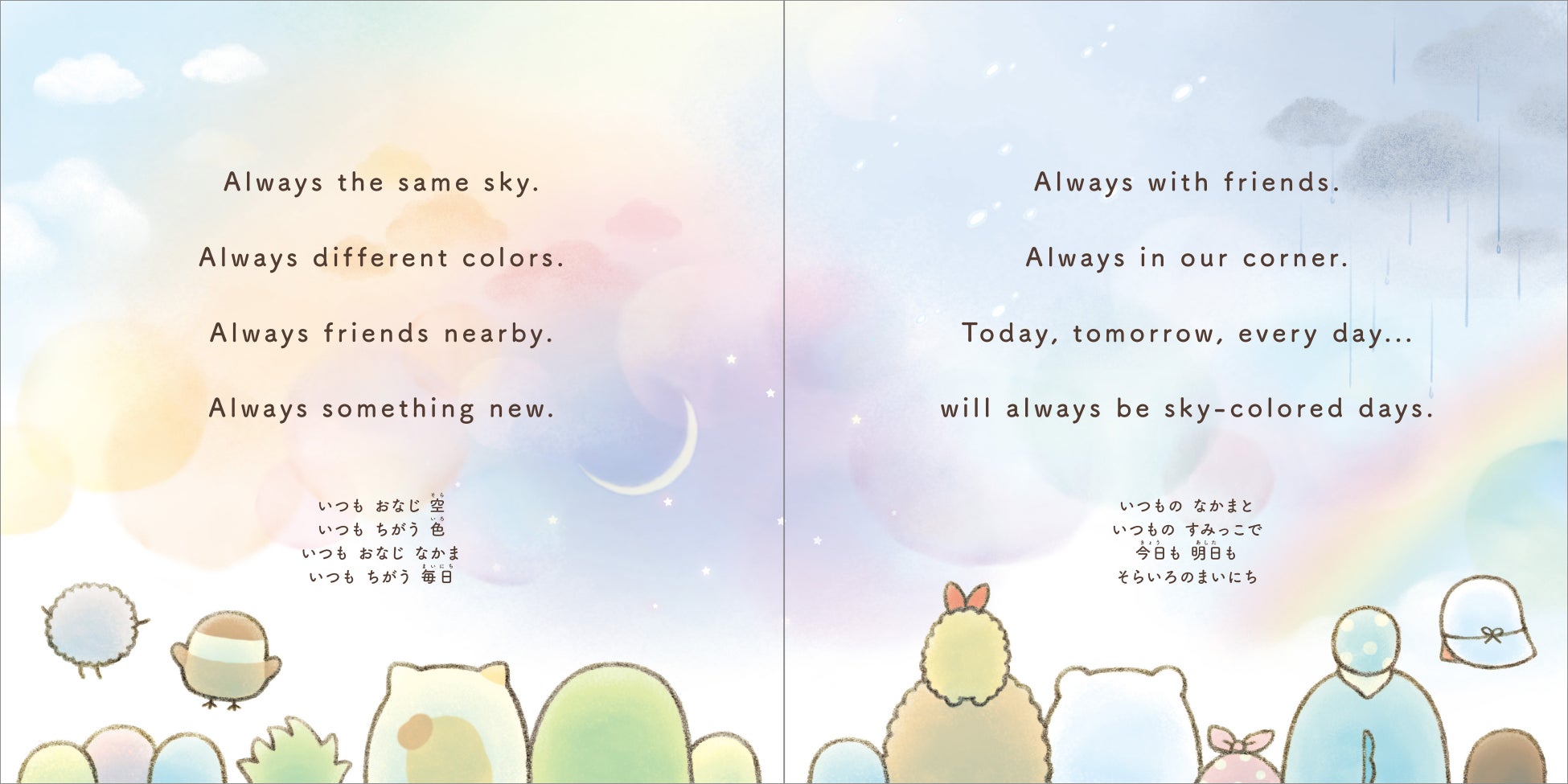 本書はこの『絵本 すみっコぐらし そらいろのまいにち』の翻訳英語と原作の日本語、二か国語を併記した“バイリンガル版”。英語がニガテな人や、英語初心者の人でも、辞書を使わず内容を理解することができます。