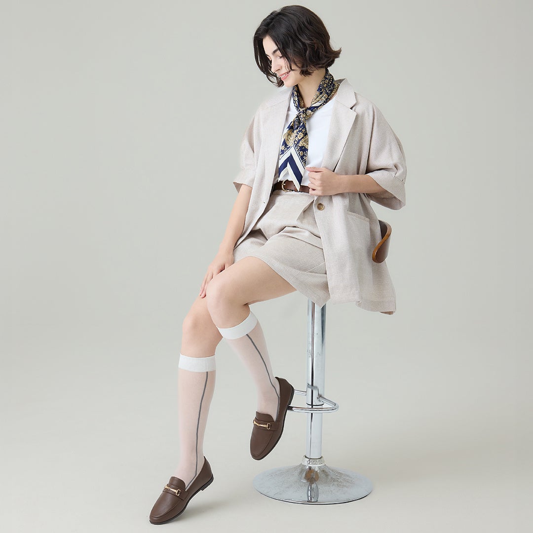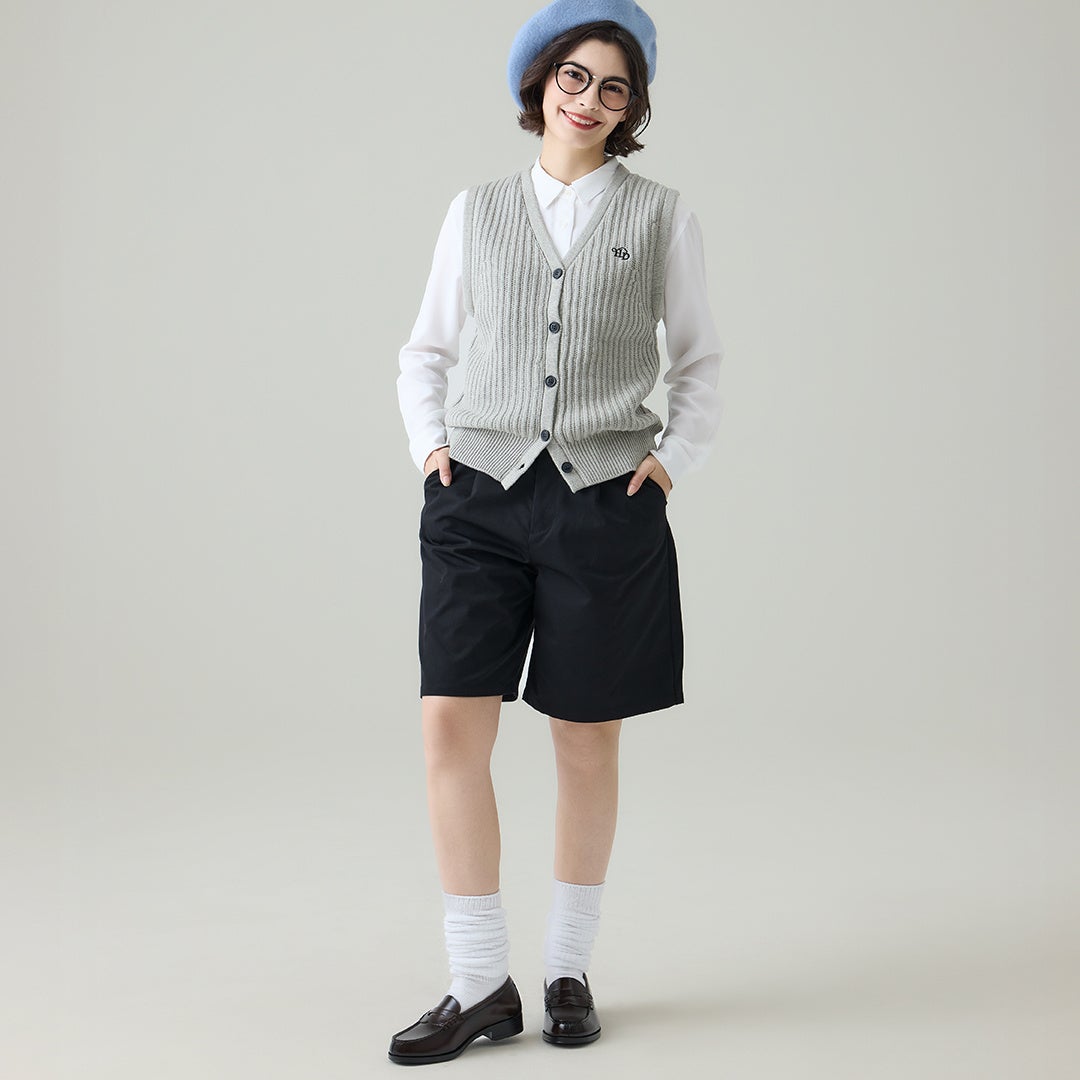 クラシックな白シャツとニットベストを、ハーフパンツで抜け感のある今っぽいシルエットに。チョコレートローファーとルーズソックスを合わせて、トラッド感と遊び心をプラス。学生風のムードを残しつつ、大人っぽさも感じられるスタイル。