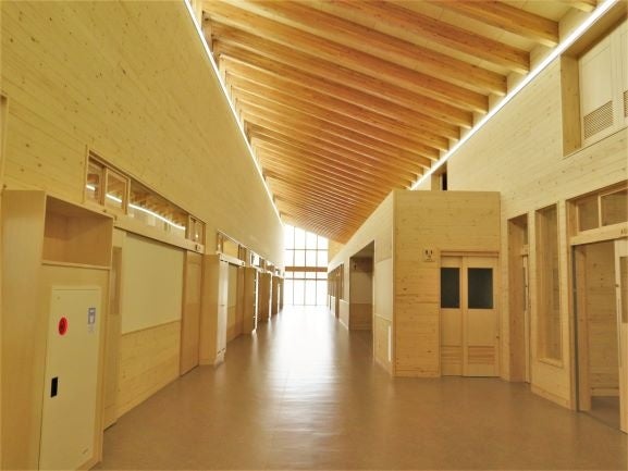 地域の林業関係団体が協力し町内の認証森林から産出されたトドマツ・カラマツの木材を使用した校舎。大規模木造建築物では国内初となるプロジェクト認証(全体認証)を取得しました。