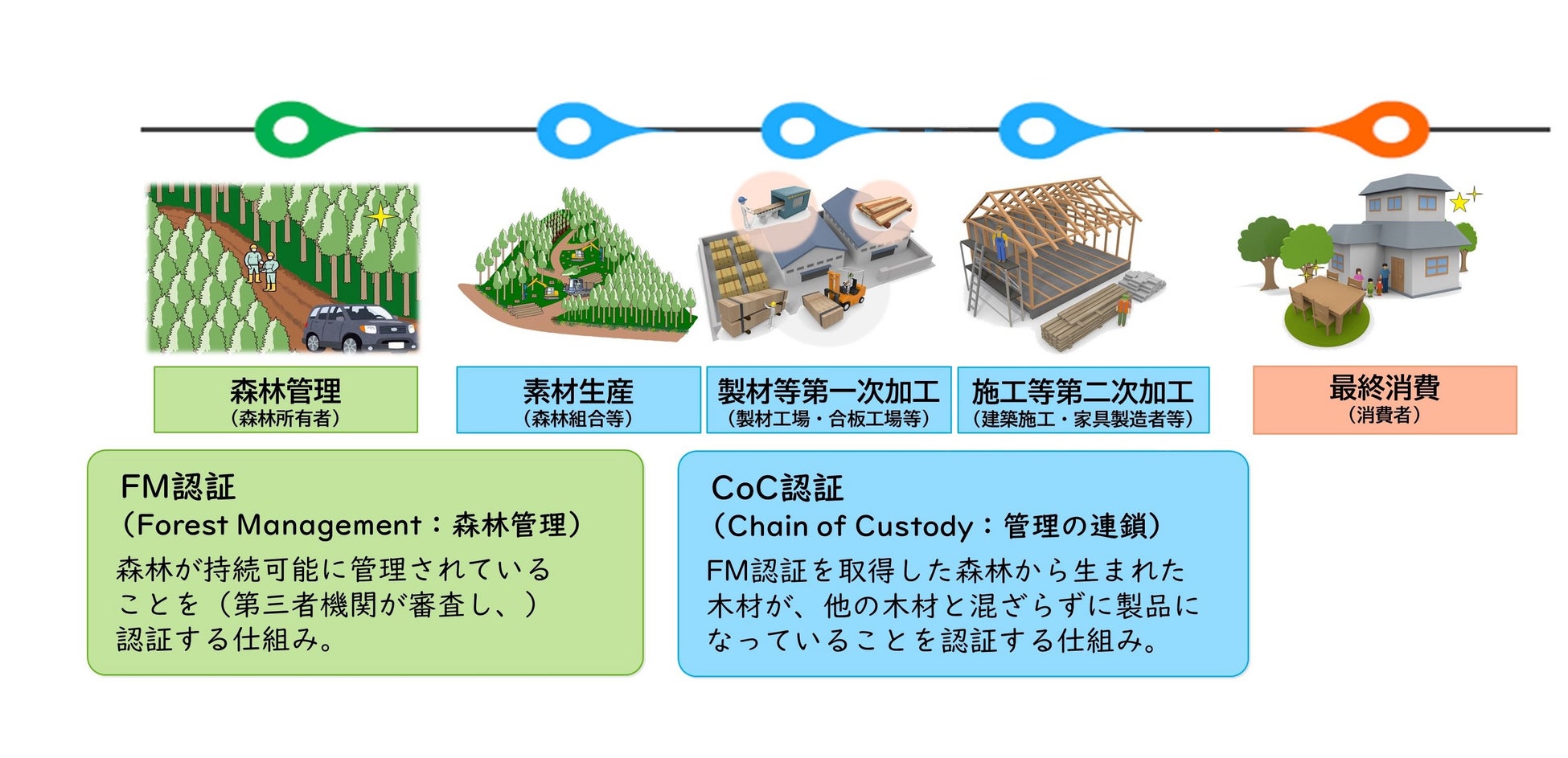 COC認証の対象となる業種は、製材・木材チップ工場、木材加工業者、製紙会社、流通業者など多岐に渡ります。