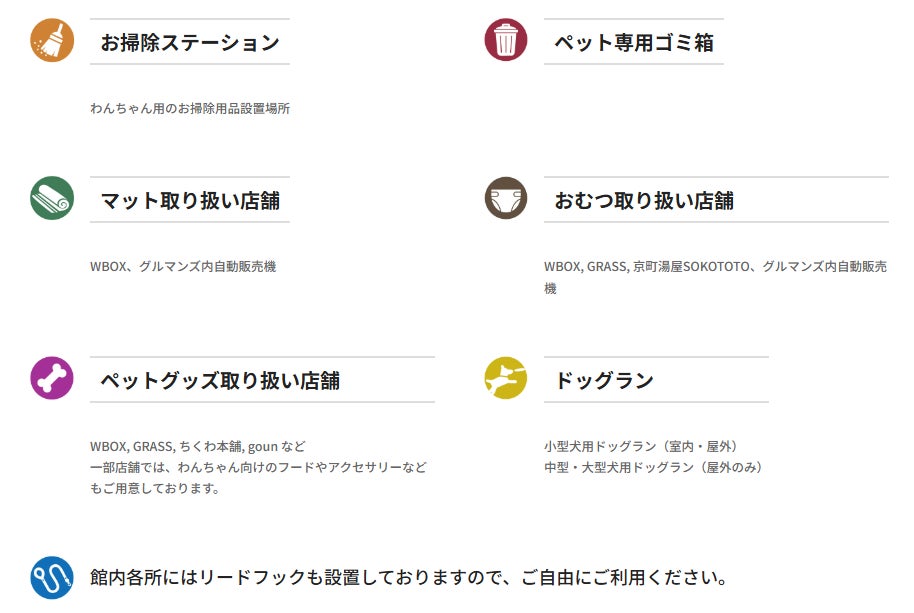 ドッグラン・お掃除ステーション・リードフックなどの設備を館内各所に設置しています。