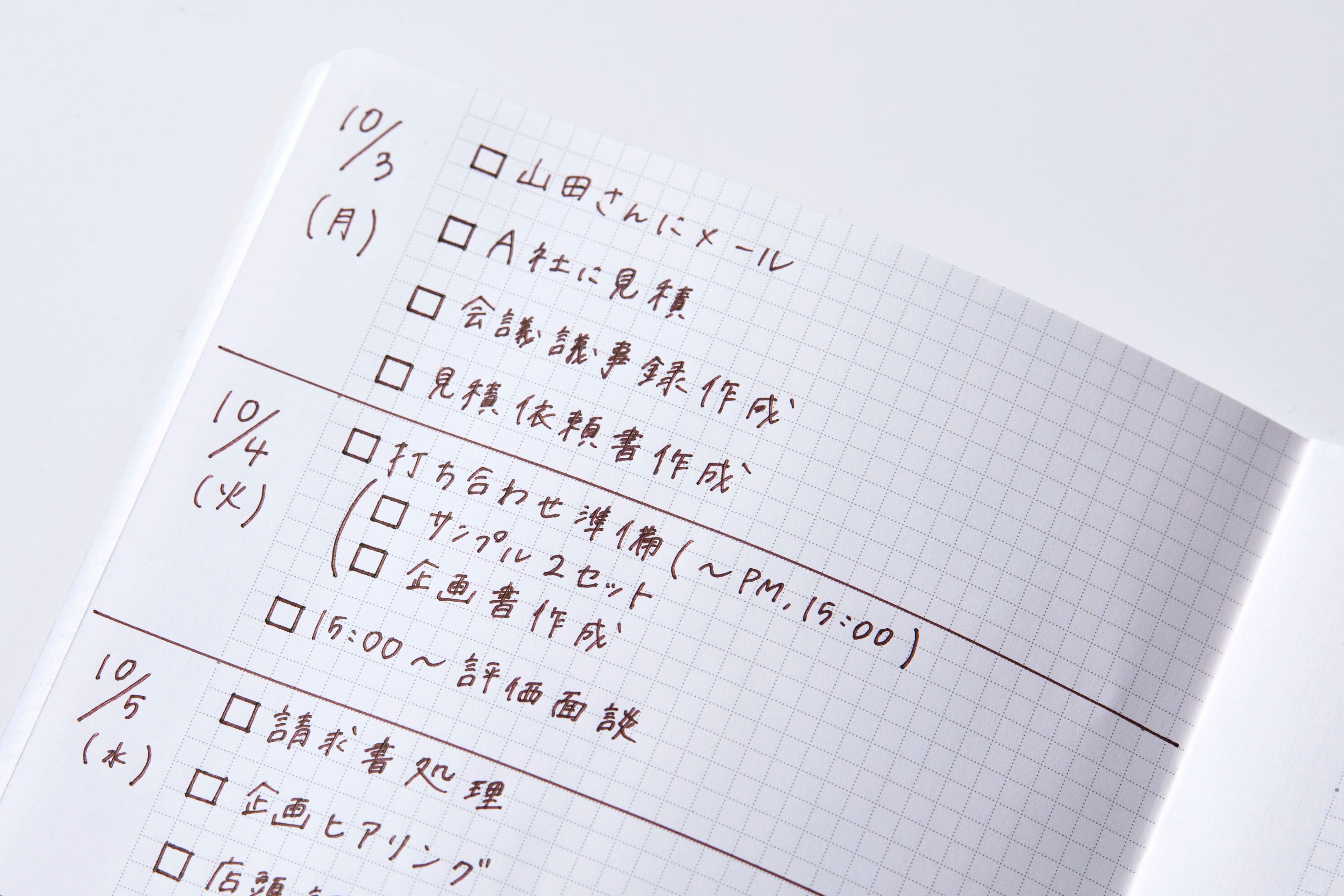 各ページ左には見出し欄があり、日付やタイトルを書き込むことで、必要なページが探しやすいフォーマットです。図形や文字が書きやすい約3mmの方眼罫を採用し、ページを5分割できるガイドが付いているので、毎日のスケジュールやタスク管理がしやすくなっています。
