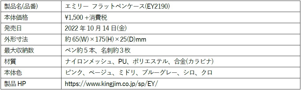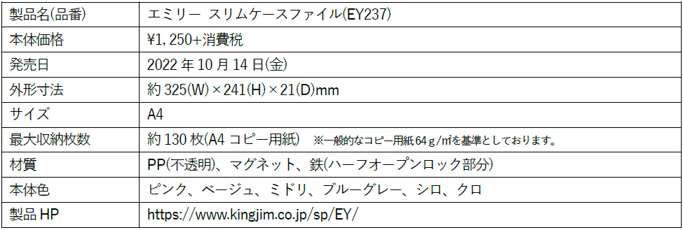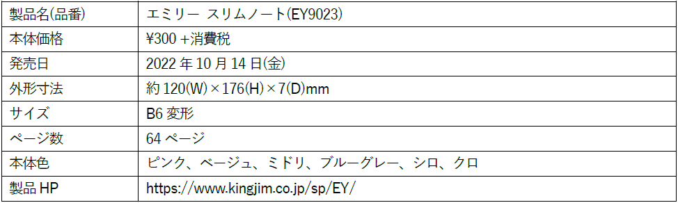 株式会社キングジム(本社:東京都千代田区 代表取締役社長:宮本 彰)は、ステーショナリーシリーズ「EMILy(エミリー)」の新ラインアップとして「スリムノート」「フラットペンケース」「スリムケースファイル」を2022年10月14日(金)より発売します。初年度販売目標数量は新製品合計で10万8千個です。