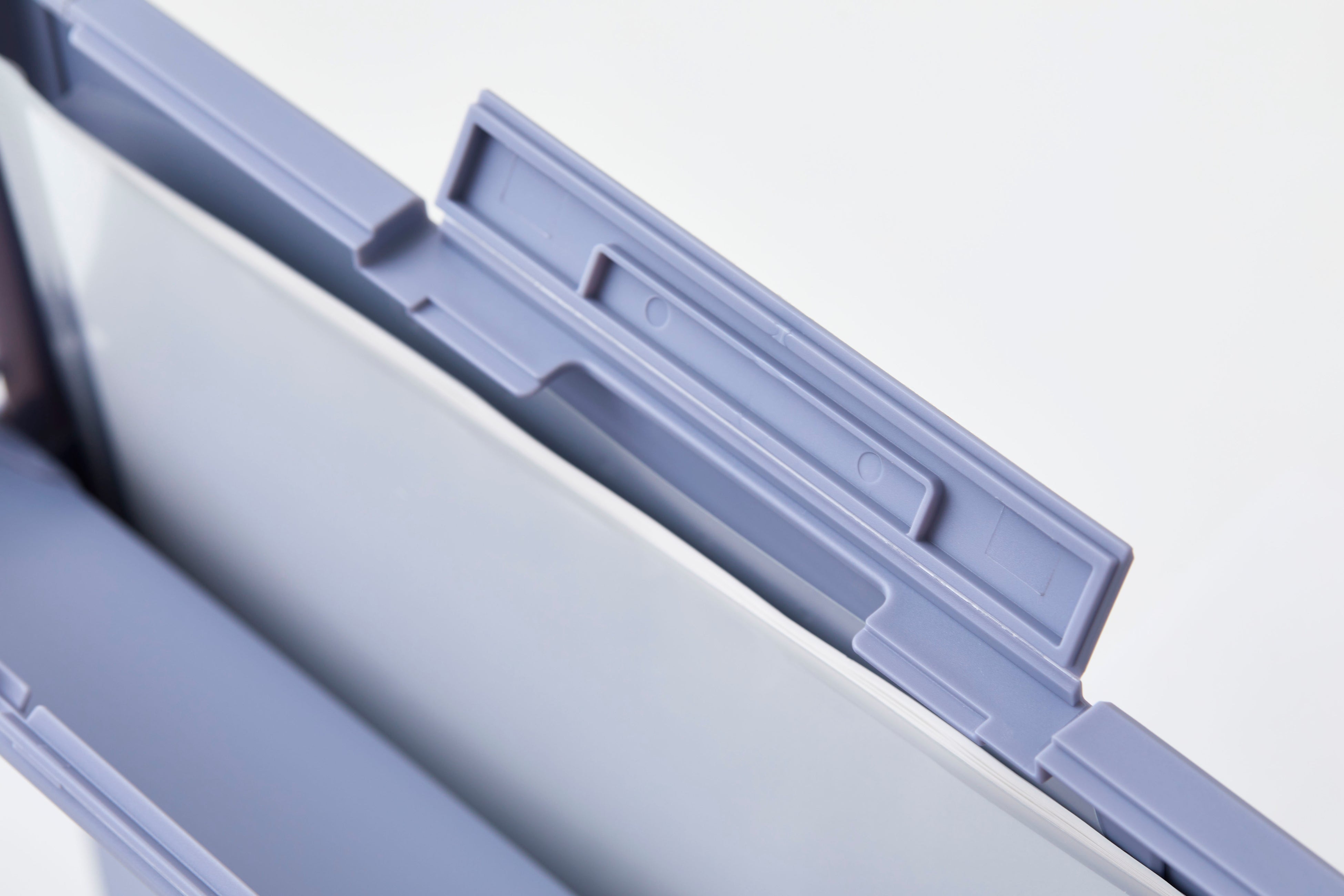 A4のクリアーホルダーをそのまま入れられる少し大きめの設計です。取り出し口は切り欠け仕様のため、フレームに指が引っかかることなく、書類の出し入れもスムーズです。