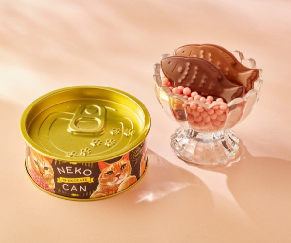 猫ちゃんが大好きな猫缶をモチーフにした商品です。エンボスで蓋のプルタブを表現したり、魚型の2種の味のチョコレートを入れた遊び心もある商品になっています。