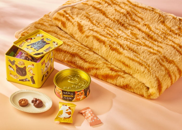 コラボレーション商品のブランケットの「茶トラ」柄は、メリーチョコレート社内から募集した猫ちゃんをモデルに、色味やトラ柄にこだわってつくりあげました。コラボレーション商品限定のチョコレートの猫缶もお揃いの茶トラの猫ちゃんをイメージしたデザインです。