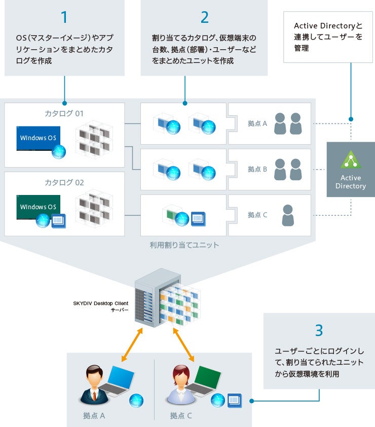 大規模ユーザ向けシンクライアントシステム「SKYDIV Desktop Client」は、仮想環境(シンクライアント)でのPCの運用管理を支援する各種機能を搭載し、テレワークやネットワーク分離環境などのさまざまな業務環境で、安全かつ便利に業務を行っていただけるようにサポート。管理画面上でユーザーへの仮想端末の割り当てや、各端末の利用状況の確認が簡単に行えるよう使いやすさにこだわった設計、画面構成となっています。また、開発とサポートのすべてを国内で対応することで、お客様に安心して運用いただけるよう取り組んでいます。