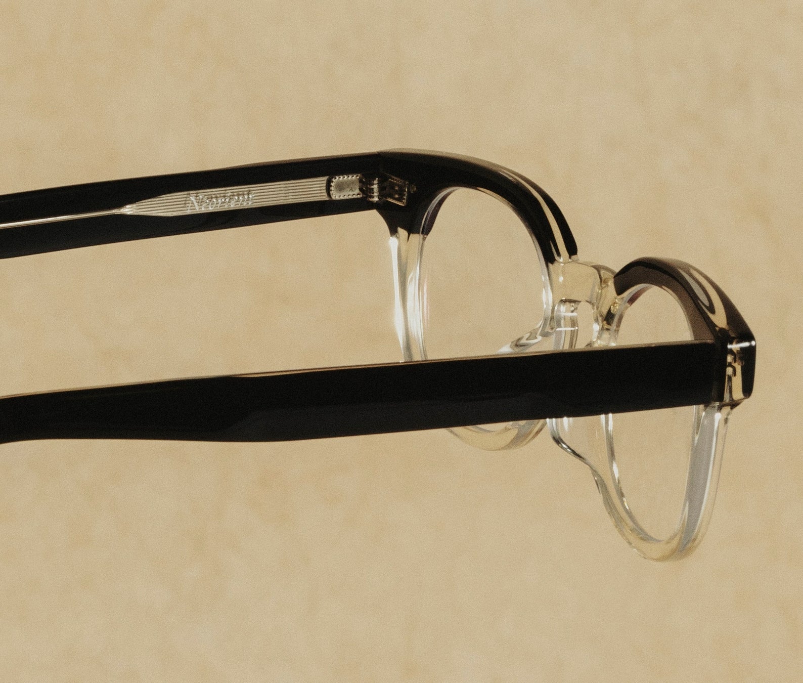 通常は4.0mm〜4.2mmの厚さで制作されるフレームのフロント部分を、本コレクションでは5.2mm〜5.4mmにて制作。贅沢に使った厚めのアセテートが古き時代のメガネを彷彿とさせます。厚い中にもテンプルには強弱をもたせ、力強さがありながらもバランスが取れており様々な人がかけやすいデザインです。