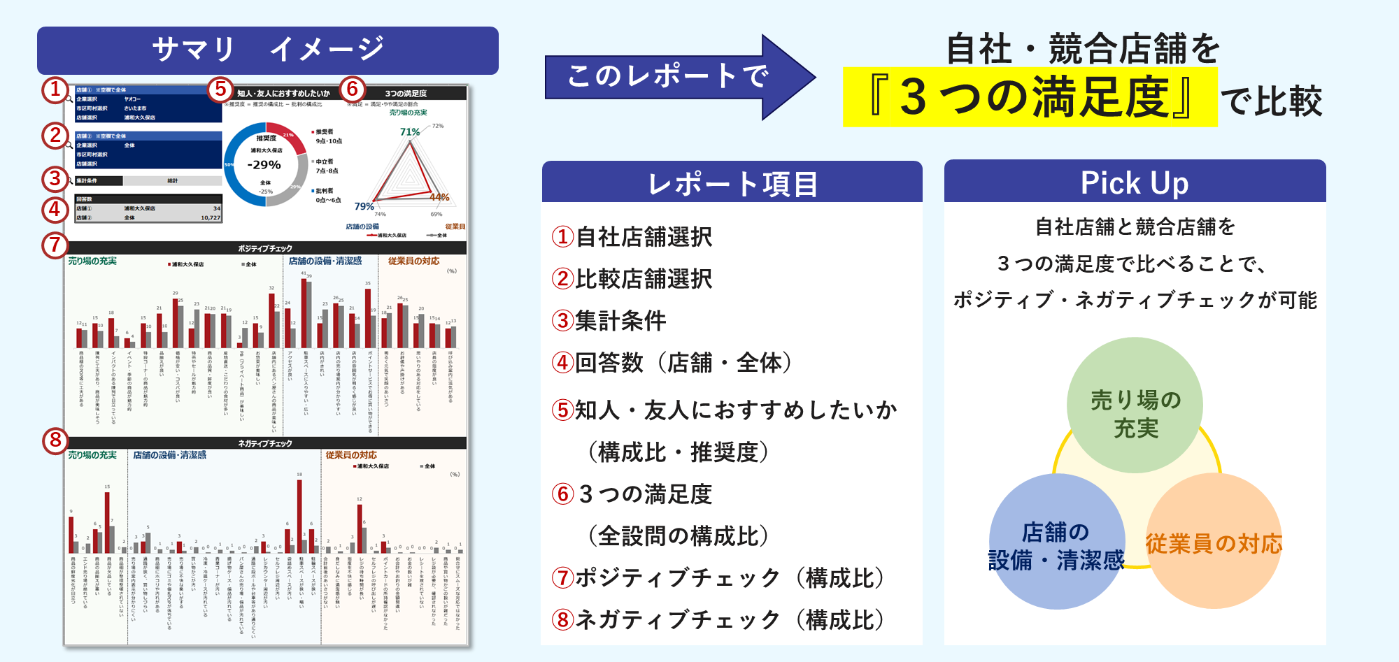 - 【特長1】店舗利用者への満足度調査をローコスト・スピーディーに実施