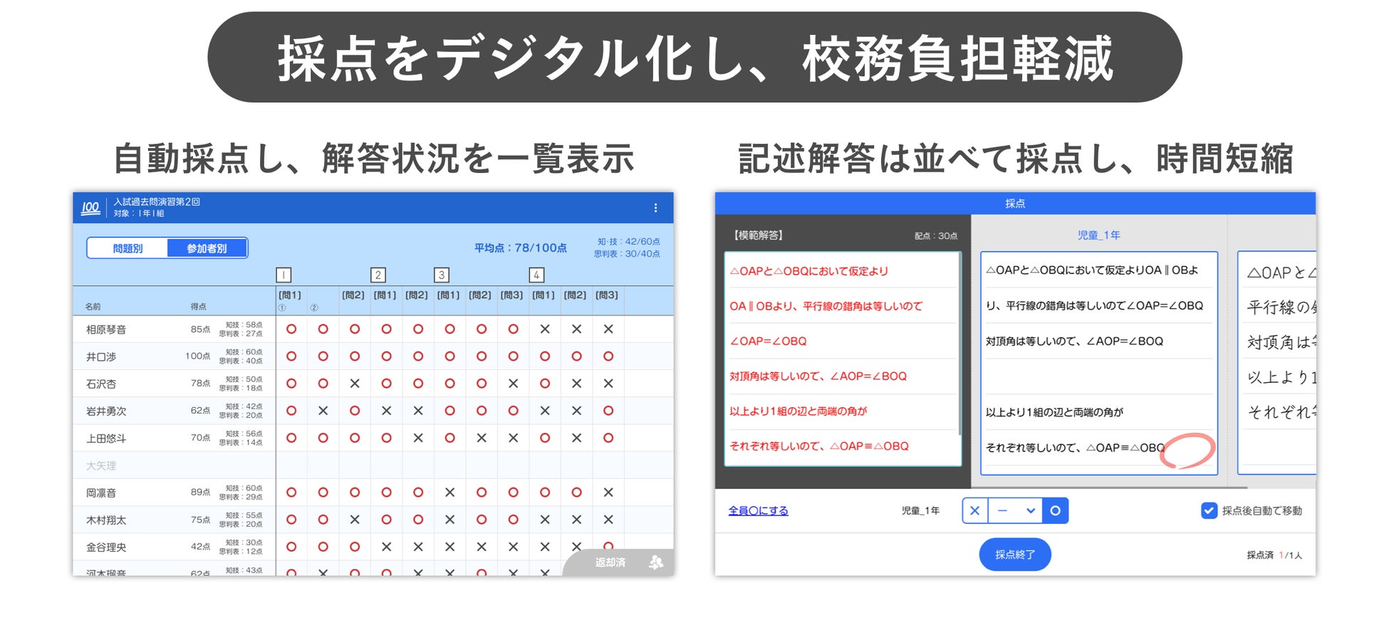 テスト問題には、基本的な「知識・技能」に加え、応用力を試す「思考・判断・表現」を問う内容を多数搭載しています。問題をオリジナルのまま配信したり、出題範囲に合わせて組み替えることも可能です。また、配点設計や評価観点に基づいた問題構成も画面上で手軽に行えます。小学校は国語と算数、中学校は国語と数学に加え、入試対策問題(国語・数学・英語)を搭載し、日常的な理解度チェックや単元・分野別のまとめテスト、入試を想定した学習まで幅広く活用できます。