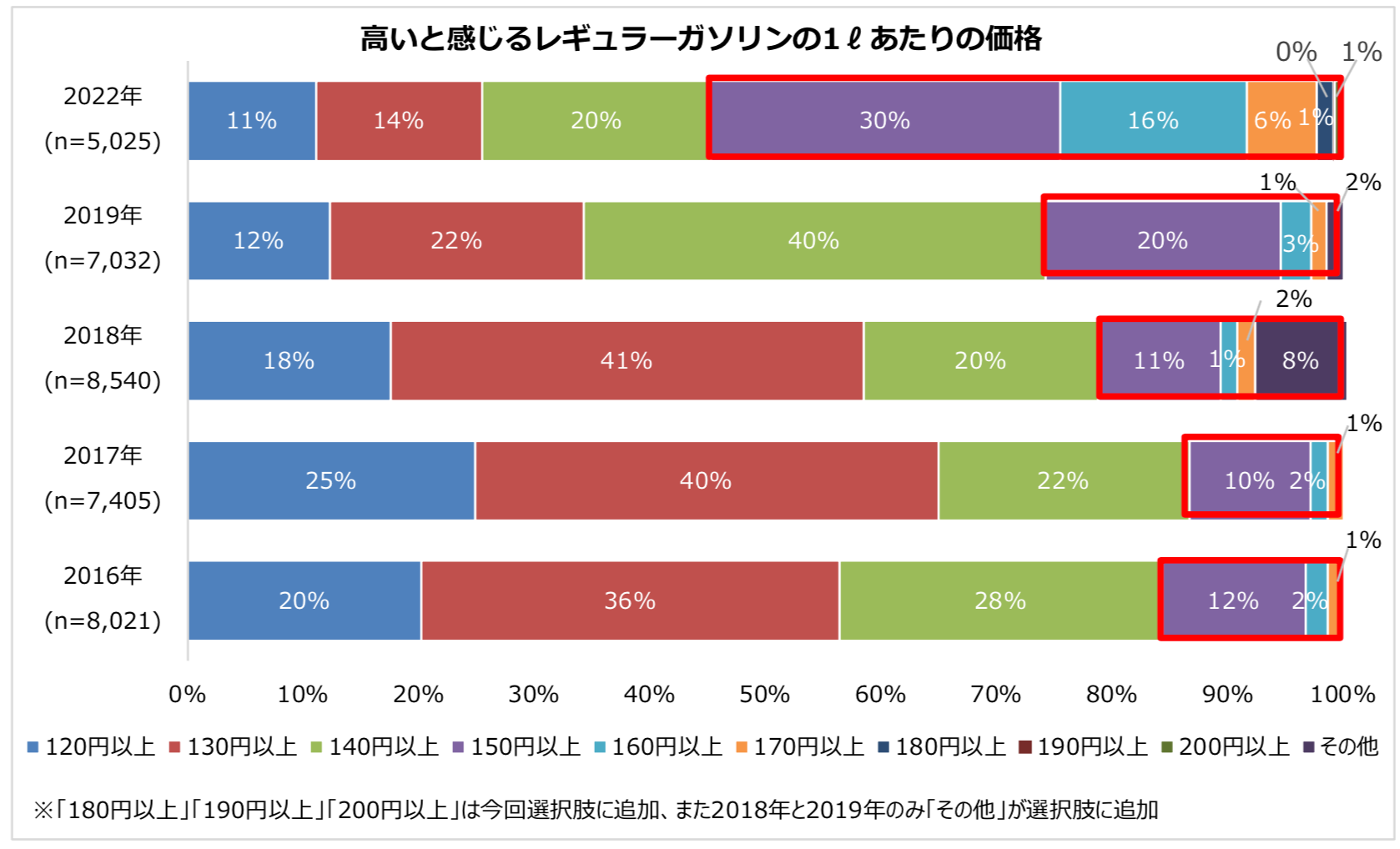 2019年までは、「150円以上/L」〜「200円以上/L」を選択した人は3割以下だったのに対して、今回は55%と初めて過半数となりました。