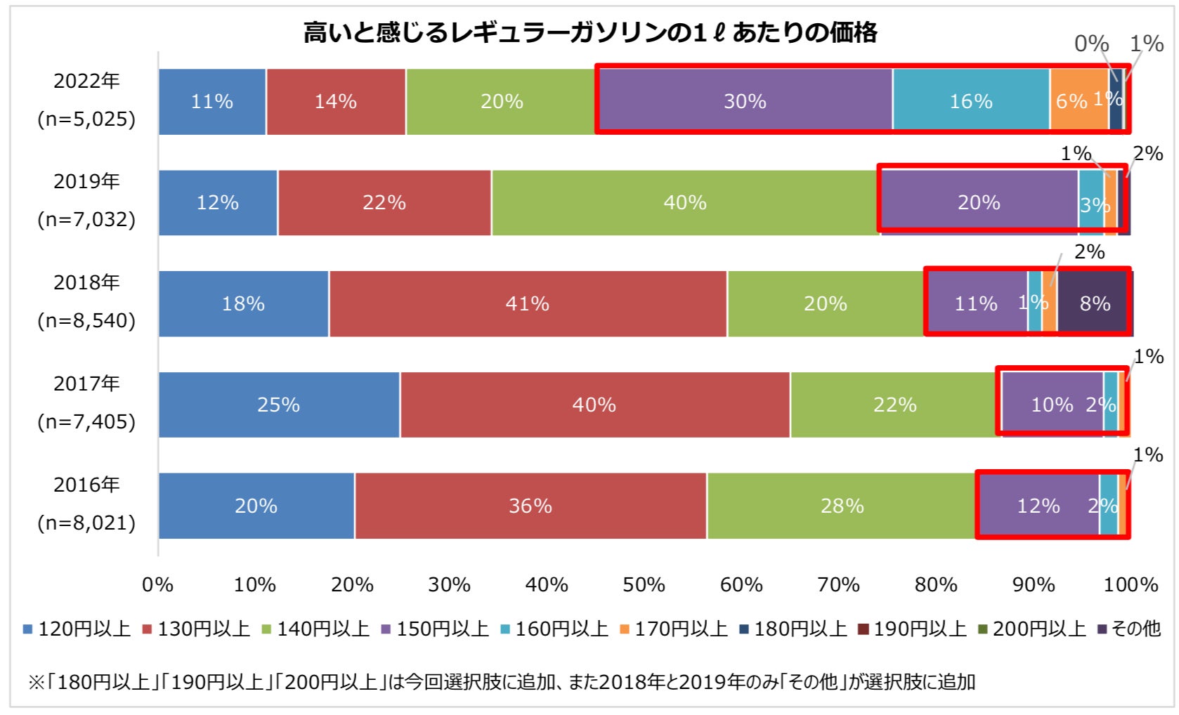 特に今年に入ってからは175円を超えることもあり、長引くガソリン価格高騰の影響で過去のアンケート結果よりも「130円以上/L」や「140円以上/L」を「高い」と感じる人が減少するなど、価格に対する意識が変化しているようです。
