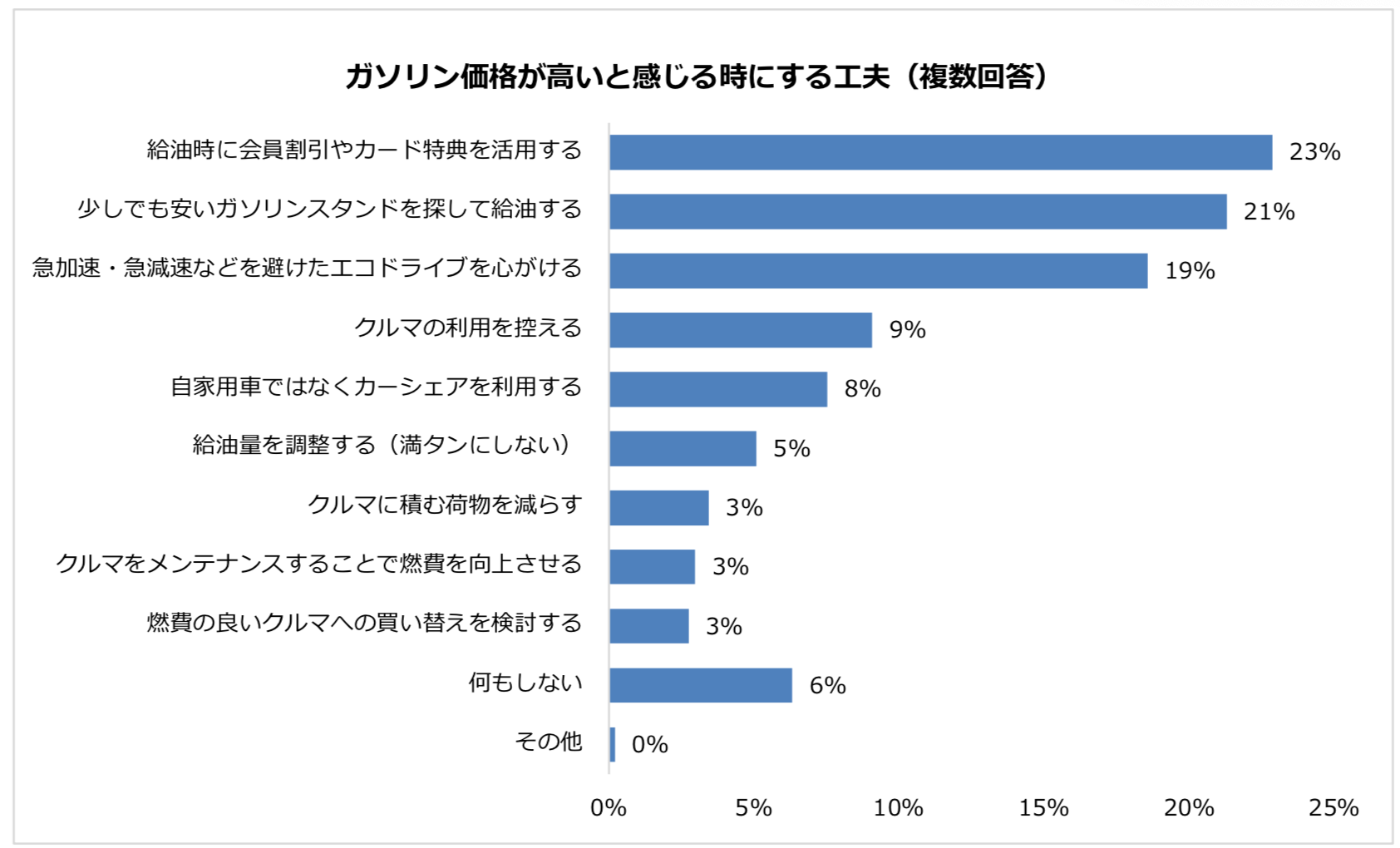 ガソリン価格が高いと感じる時にする工夫は、「給油時に会員割引やカード特典を活用する」が23%と最も多くなりました。以降、「少しでも安いガソリンスタンドを探して給油する」、「急加速・急減速などを避けたエコドライブを心がける」、「クルマの利用を控える」、「自家用車ではなくカーシェアを利用する」の順となっています。