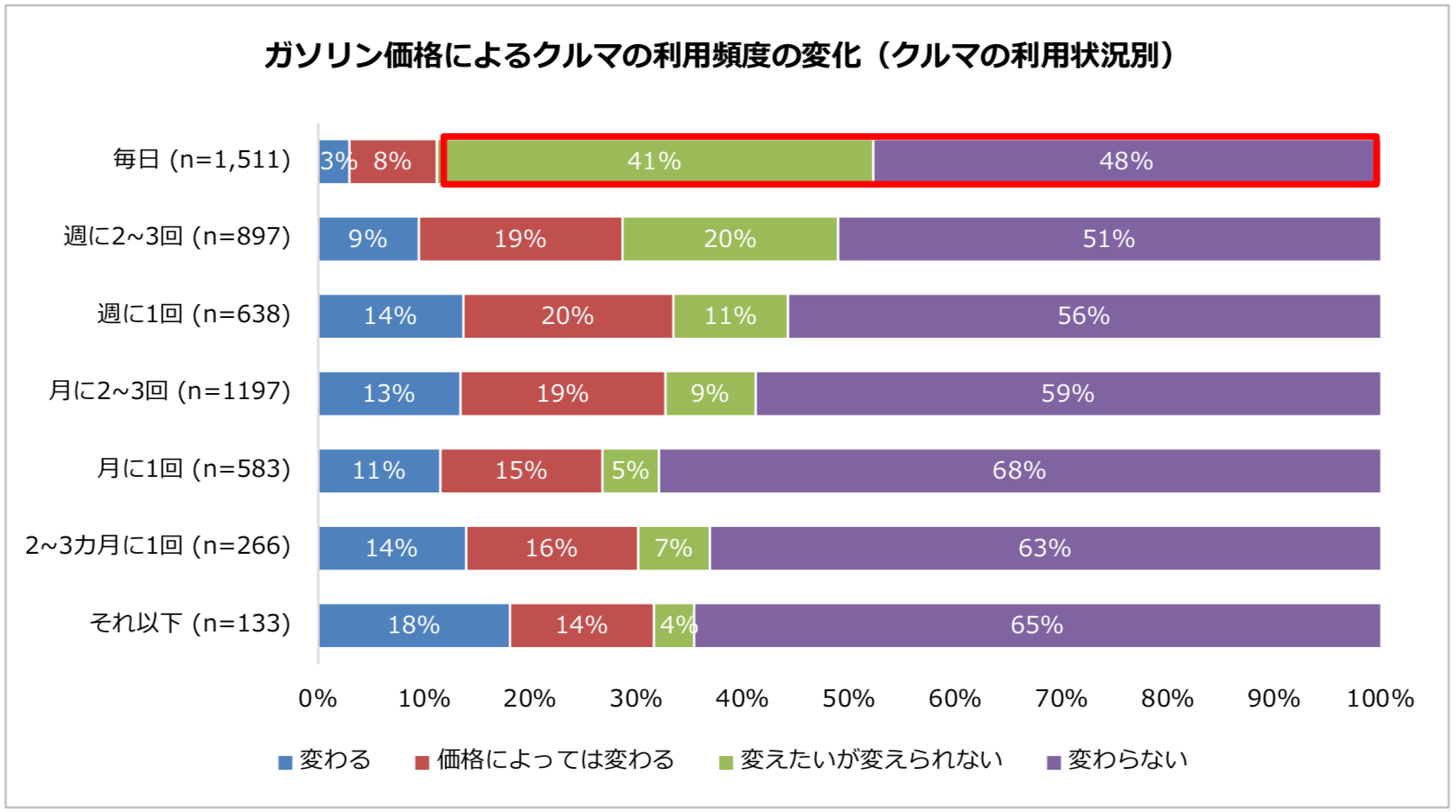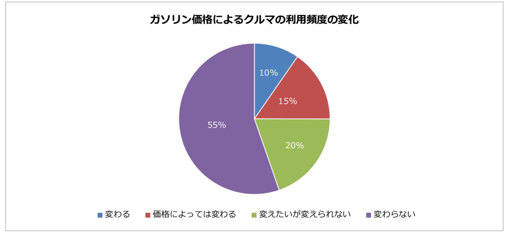 ガソリン価格によってクルマの利用頻度が「変わらない」は55%で半数を超えました。また、5人に1人は「変えたくても変えられない」状況であることがわかりました。