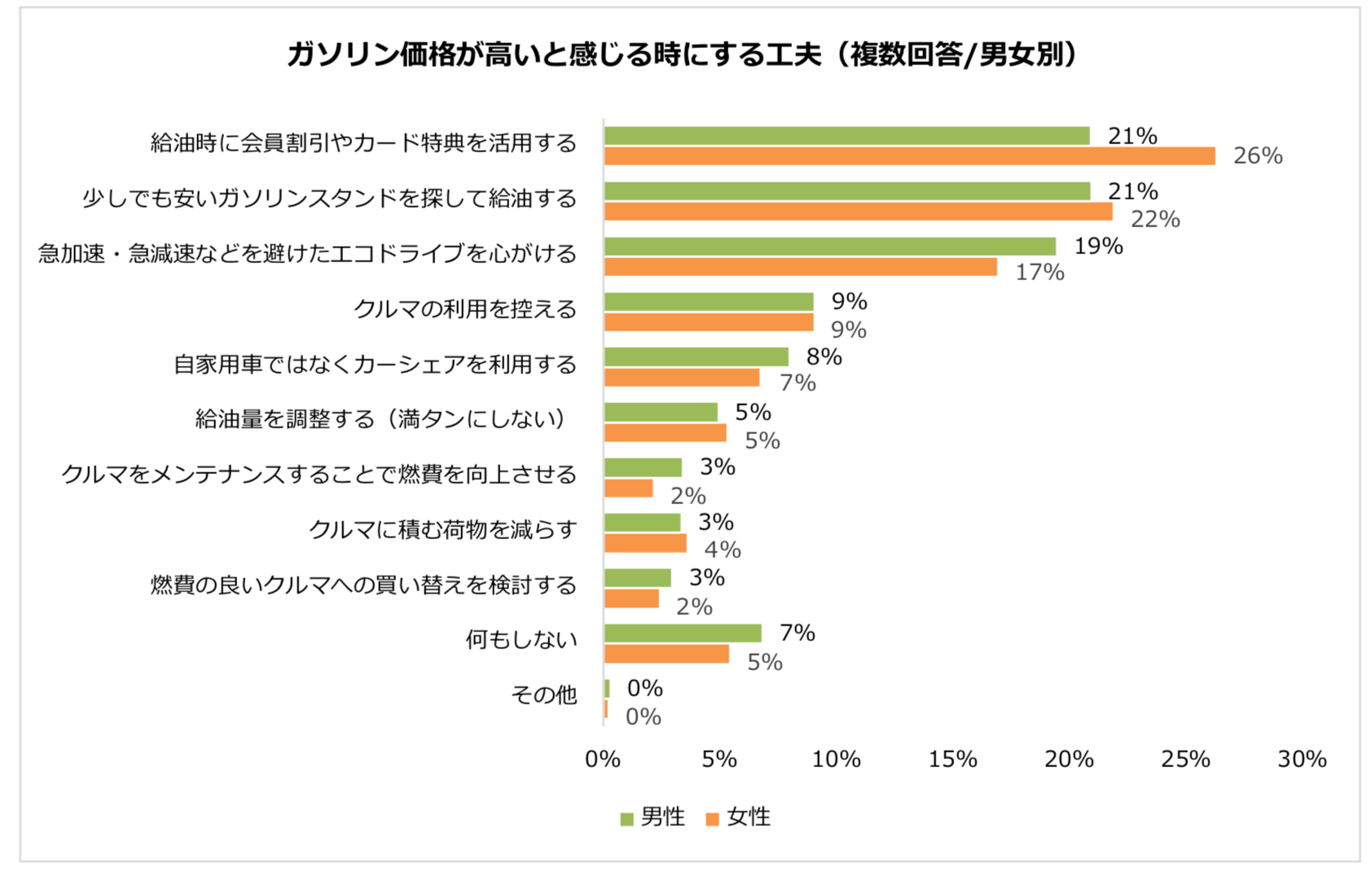 男女別で見ると、女性は「給油時に会員割引やカード特典を活用する」が26%で、男性よりも5ポイント高くなりましたが、男女とも全体的に大きな違いはなく、少しでもガソリン代を節約できるように工夫しているようです。