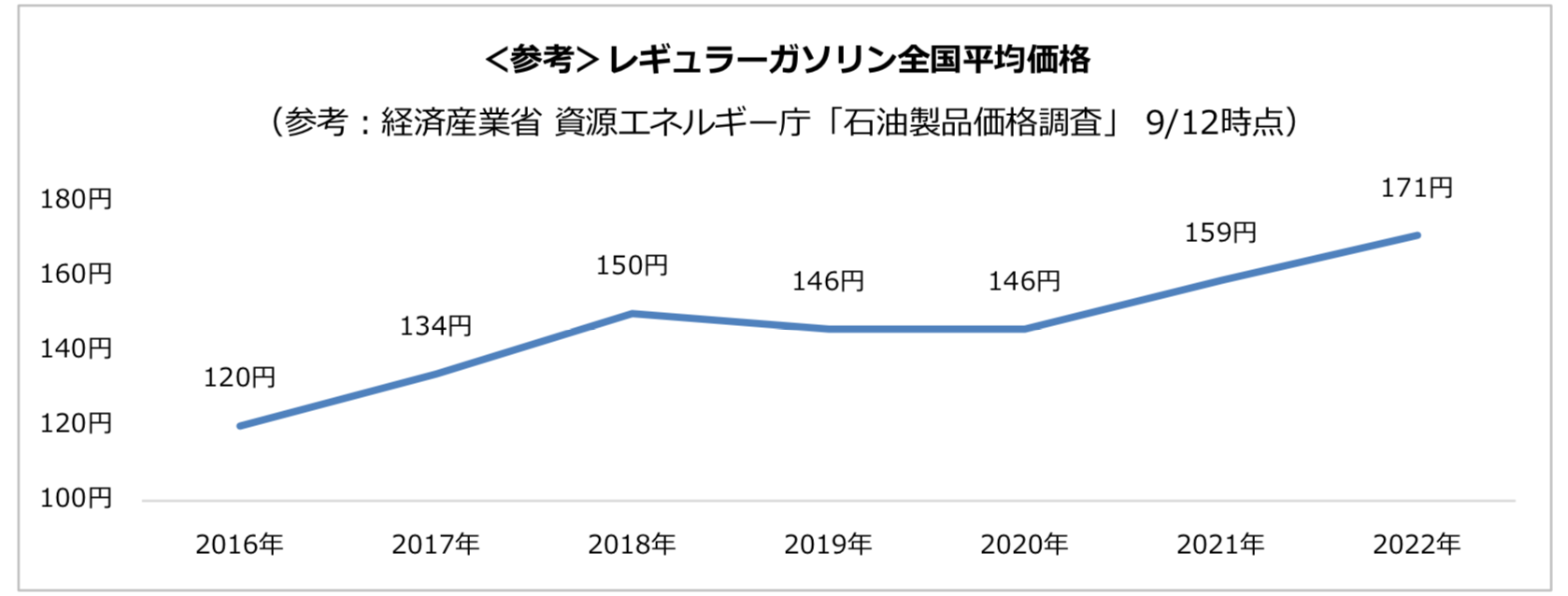 レギュラーガソリンの全国平均価格は、2017年以降130円を下回ることなく、アンケートを開始した2016年と比べると2022年は50円以上値上がりしています。