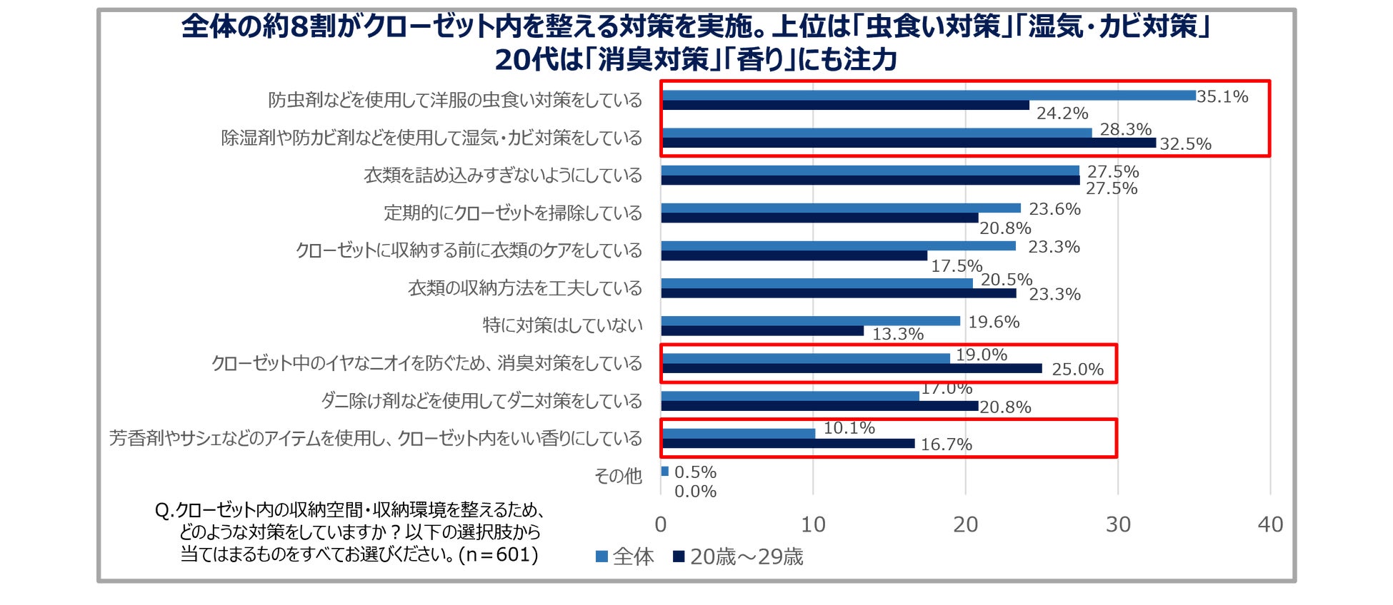全体の約8割がクローゼット内の収納空間・環境を整えるための対策を実施。上位は「虫食い対策(35.1%)」「湿気・カビ対策(28.3%)」という結果に。20代は「消臭対策」「香り」にも注力。