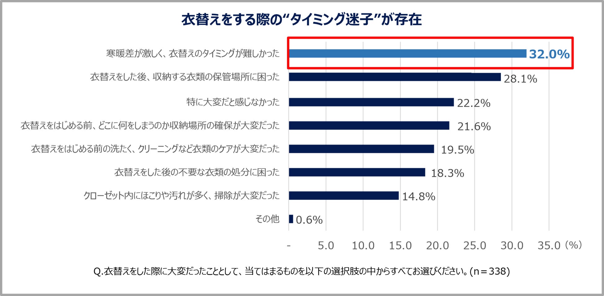 回答者に今年の冬から春・夏にかけての衣替え実施有無について質問したところ、衣替えを実施したのは全体の56.2%でした。また衣替えをした人に、衣替えの際に大変だったことを聞いたところ、「寒暖差が激しく、衣替えのタイミングが難しかった(32.0%)」が最も多く、近年の異常気象などによる寒暖差の影響で、衣替えの時期に悩む“タイミング迷子”の存在が見受けられました。