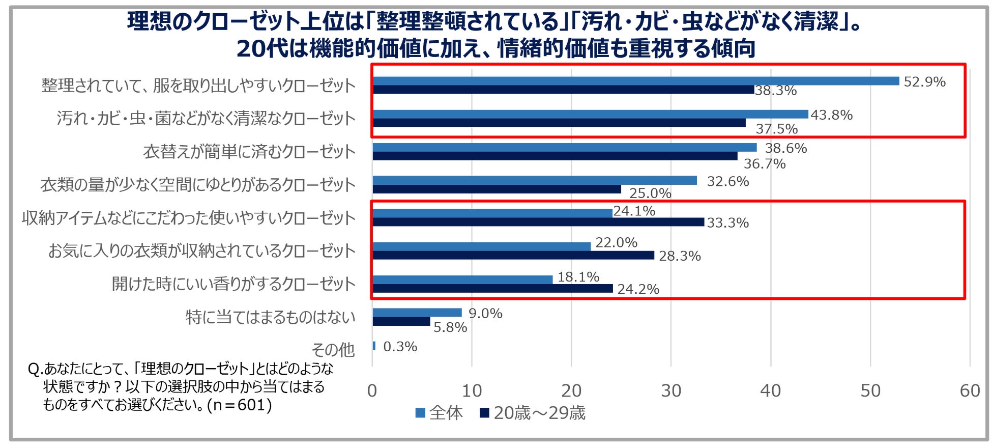 また、全体の約4割が自身のクローゼットを「理想の収納空間」と回答する中、20代は53.3%で他の年代と比べ高い傾向にありました。さらに「理想のクローゼットの状態」としては、「整理されていて、服を取り出しやすい」「汚れ・カビ・虫・菌などがなく清潔」「衣替えが簡単に済む」といった機能面に対する価値が上位にあがる中、20代では「収納アイテムなどにこだわり使いやすい」「お気に入りの衣類が収納されている」「開けたときにいい香りがする」の項目が全体に比べて高い結果となり、お気に入りのアイテムや香りをクローゼットの“理想”として求めている様子がうかがえました。