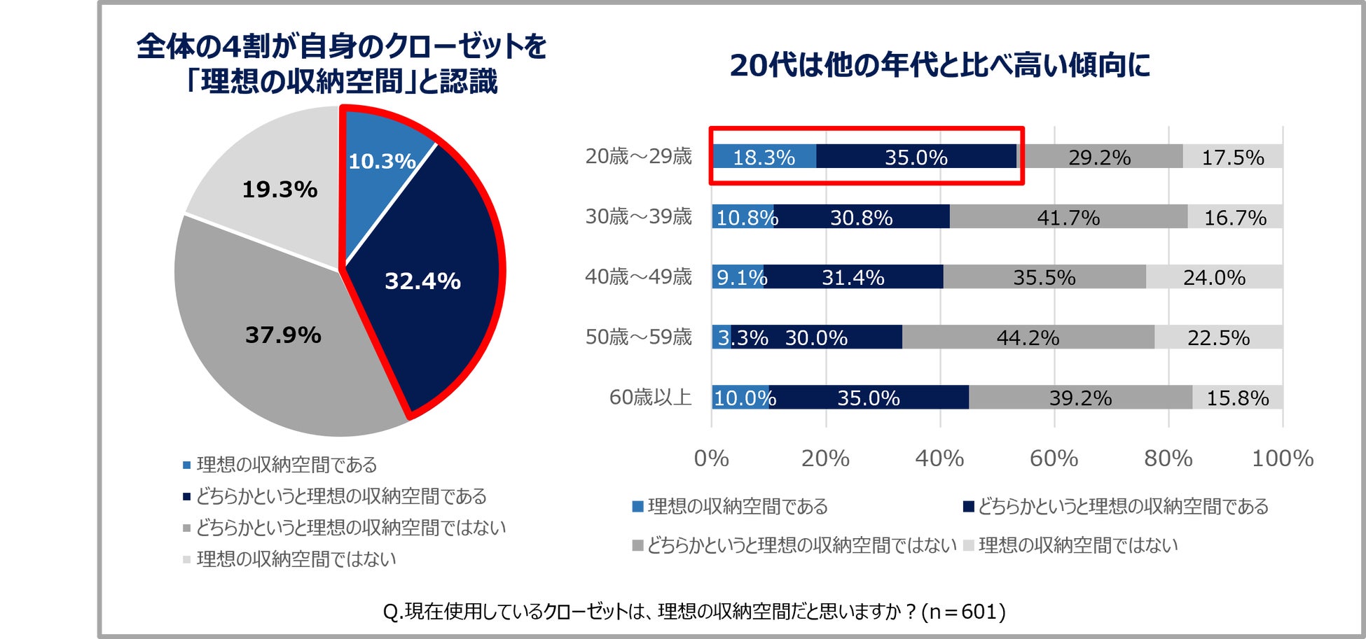 全体の約4割が自身のクローゼットを「理想の収納空間」と認識する中、20代は53.3%と、他の年代と比べ高い傾向に。