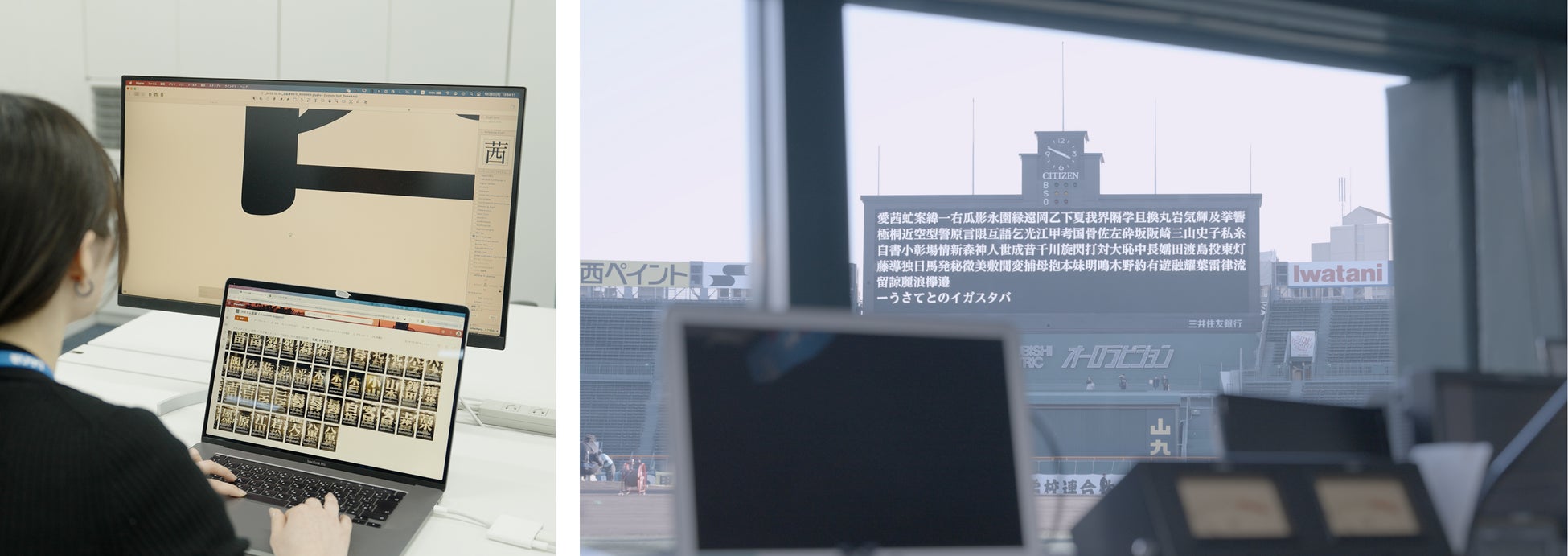 阪神甲子園球場のスコアボードでは、1983年まで、職人が黒い板に毛筆で手書きをした文字を使用しており、その独特な字形が「甲子園文字」として親しまれてきました。スコアボードを電光掲示に改修した1984年以降も、その伝統を受け継ぐべく、同球場の職員が甲子園文字を踏襲したオリジナルの文字を作り、表示することで、その伝統を受け継いできました。