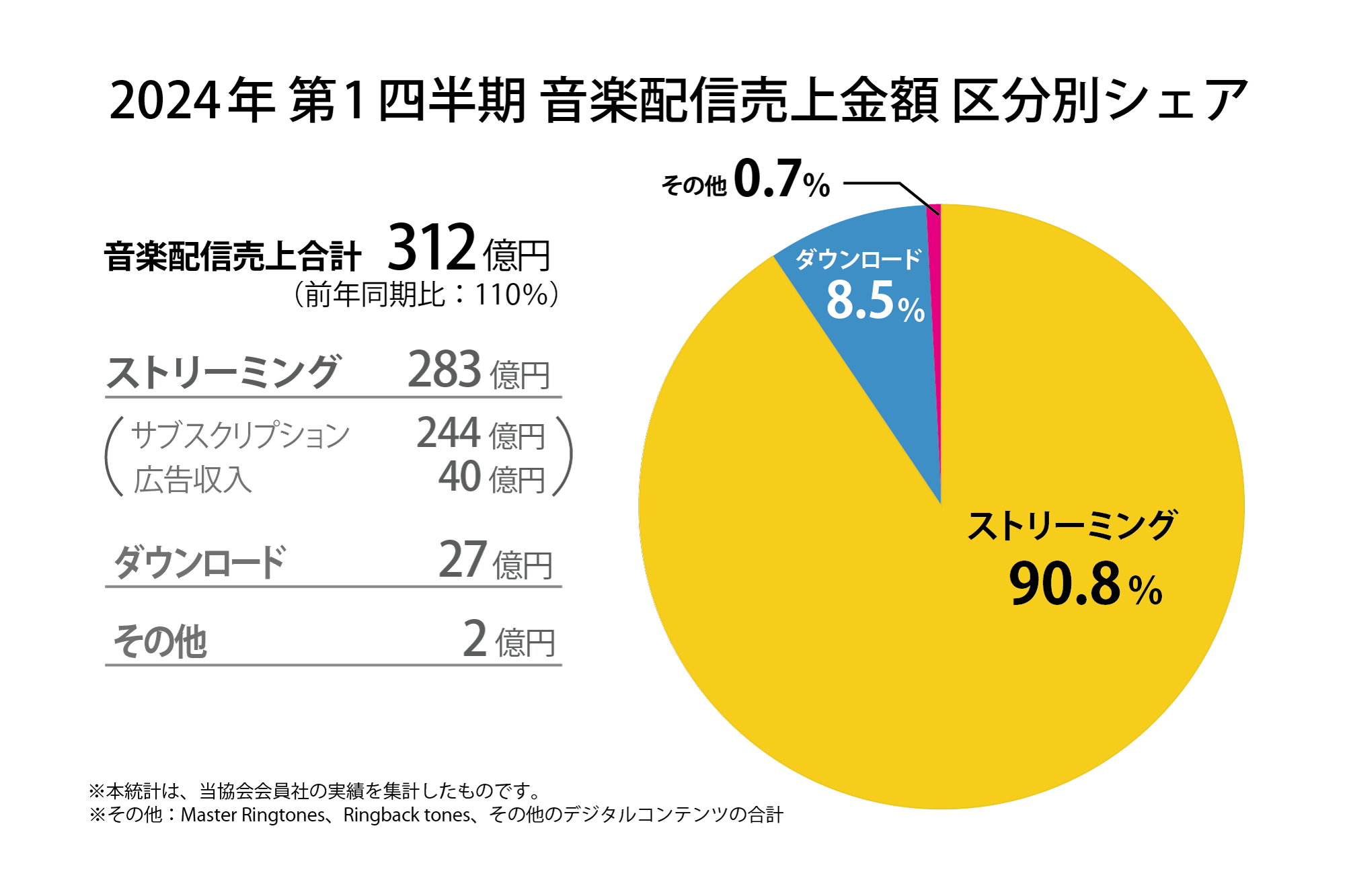 2024年第1四半期音楽配信売上は前年同期比110%の312億円 、四半期ベースで初の300億円超え