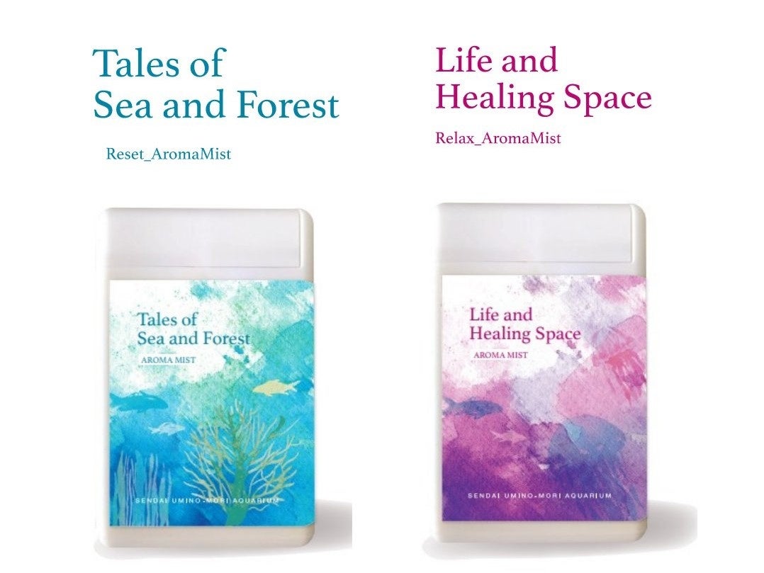 東北の豊かな天然素材と人材を活用した持続可能なものづくりにこだわっている「株式会社グリーディー」さまと共同で、うみの杜オリジナルアロマを作成しました。「UMINOMORIフォトスポット」、「クラゲのいやし ~Colorful Life~」それぞれの空間をイメージした、うみの杜らしい爽やかな香りのアロマが誕生しました。「UMINOMORIフォトスポット」では「Tales of Sea and Forest」、「クラゲのいやし ~Colorful Life~」では「Life and Healing Space」の香りをお楽しみいただけます。また、1階 「umimori shop」にてスプレー型アロマの販売も行っております。