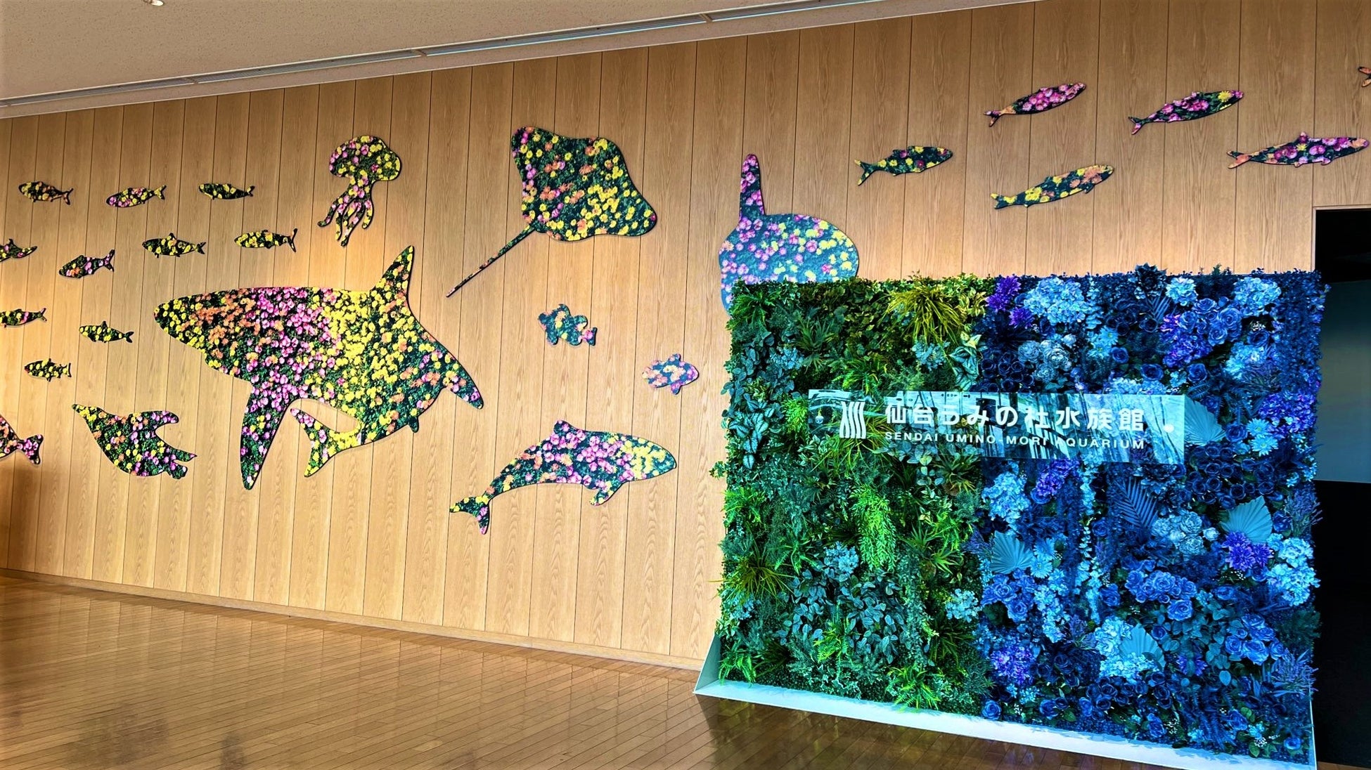 木目調が特徴的なエントランスに、仙台うみの杜水族館のロゴカラーであるブルーとグリーンで“海”と“杜”を表現したフラワーモザイクアートが登場中です。生きものたちのシルエットもボタニカルデザインのシート装飾で彩られ、エントランス全体が華やかなフォトスポットに変身しました。春の思い出にぴったりな記念撮影をお楽しみいただけます。