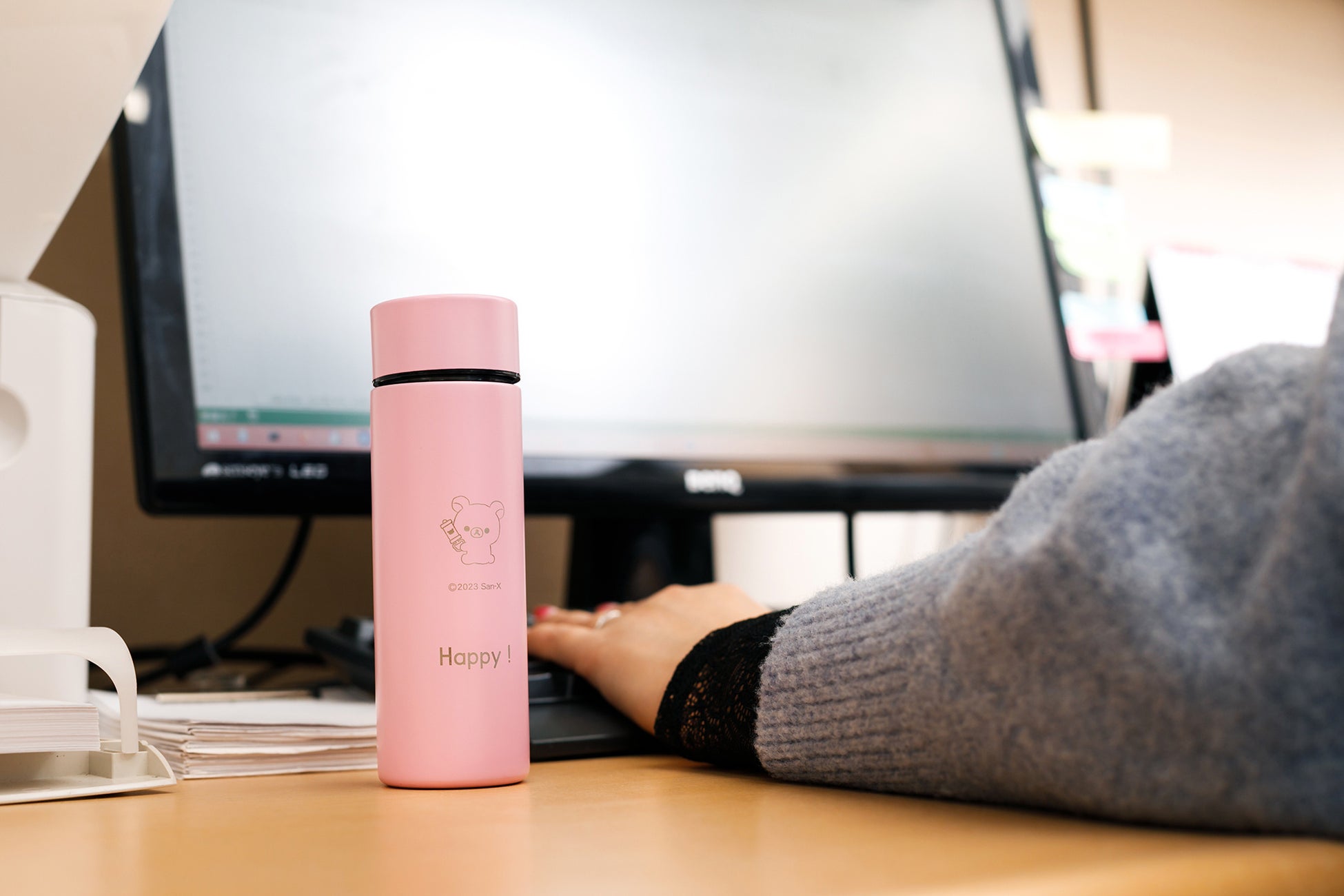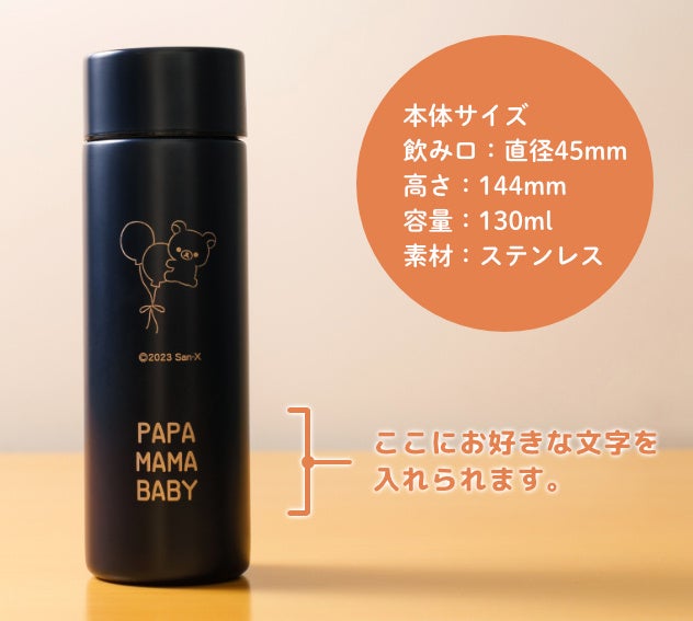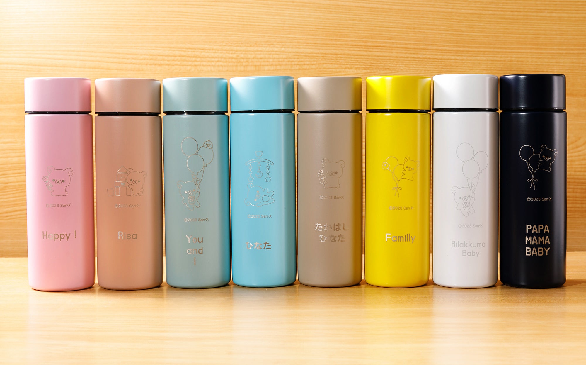 リラックマとコリラックマ、キイロイトリが登場する、8種類から選べるかわいいイラスト入り。名前を入れたりメッセージを入れたり、好きな文字を入れて、じぶんだけのマイボトルにカスタマイズできます。