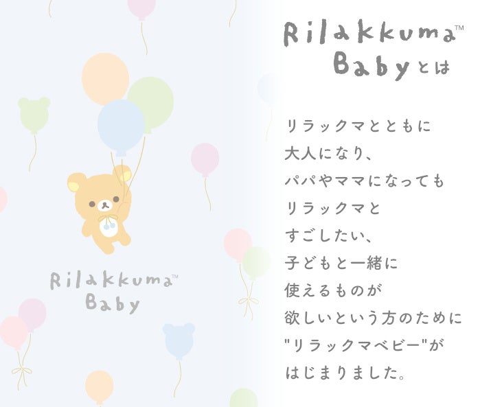 リラックマとともに大人になり、パパやママになってもリラックマとすごしたい、子どもと一緒に使えるものが欲しいという方のために“リラックマベビー”がはじまりました。ベビーグッズならではの優しい色づかい、大人が持っていても癒されるやわらかさをデザインで表現しました。