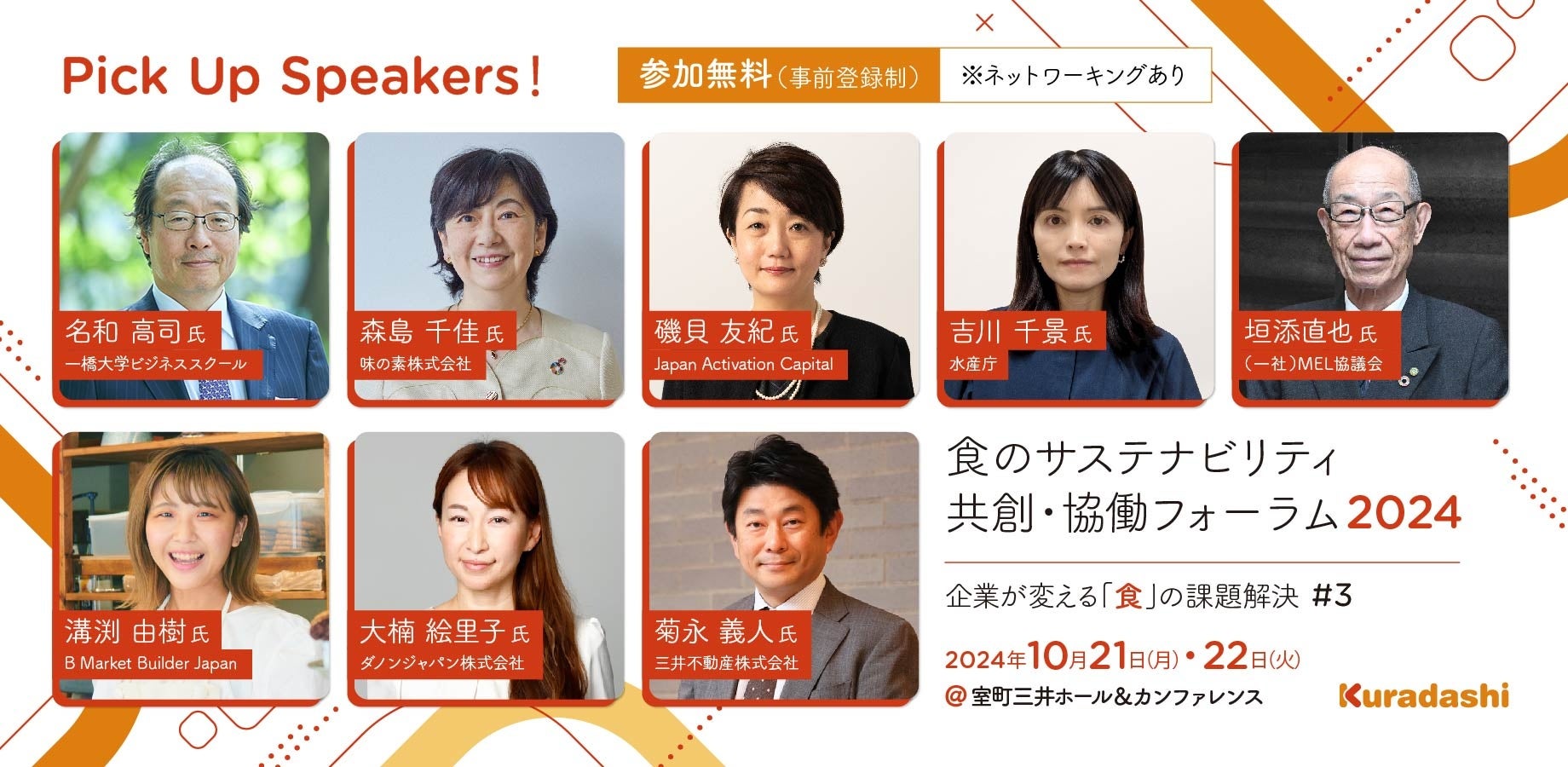 ソーシャルグッドマーケット「Kuradashi」を運営する株式会社クラダシ(本社:東京都品川区、代表取締役社長CEO:河村晃平、以下「クラダシ」)は、10月21日(月)・22日(火)に開催する、「食のサステナビリティ共創・協働」をテーマにしたフォーラムにおいて、新たにキリンホールディングス株式会社 CSV戦略部・主務 志水 豪 氏、株式会社パレスホテル ブランド戦略室 室長 柳原 芙美 氏、株式会社電通 BXクリエーティブ ・ センター 事業開発ディレクター 秋山 隆宏 氏ほかの追加登壇者が決定したことをお知らせします。