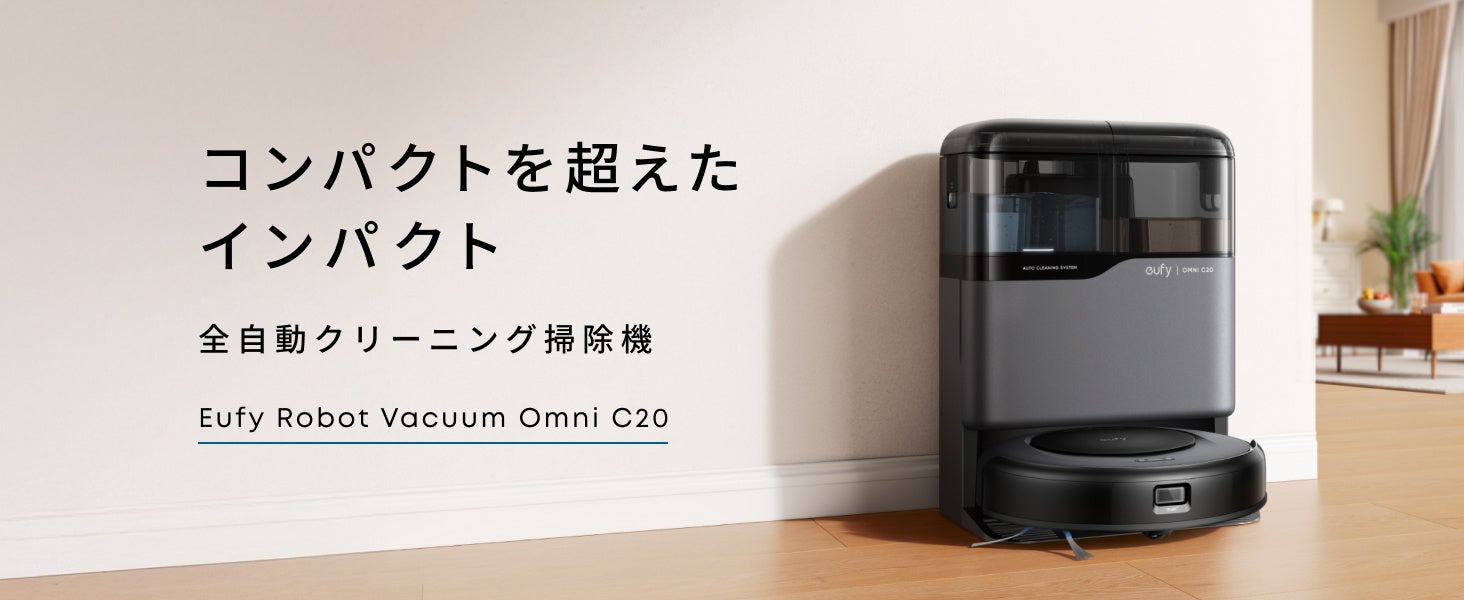 Eufyは掃除の負担を減らすことで大切な家族との時間を豊かにする製品として、ロボット掃除機での吸引と水拭き掃除に加え、2024年よりステーションでの自動ゴミ収集やモップ洗浄、乾燥が可能な全自動クリーニング掃除機を展開して参りました。この度、一番人気の定番モデル「Eufy X10 Pro Omni」や究極の機能美を追求した最高峰モデル「Eufy Robot Vacuum Omni S1 Pro」に続き、1~2人のシンプルな暮らしの方におすすめの全自動クリーニング掃除機として「Eufy Robot Vacuum Omni C20」を販売開始いたします。