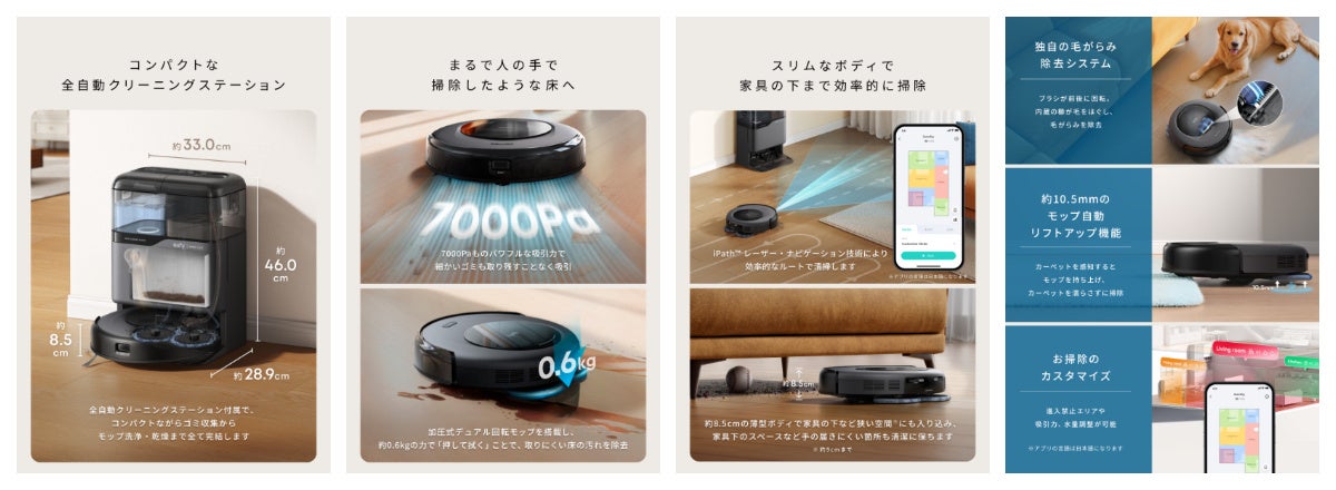 本製品はソファやベッド等の家具の下に入り込み、隈なく掃除ができる約8.5cmの高さのスリムな掃除機本体と「Eufy X10 Pro Omni」と比較して約46%小型化(※1)したステーション、両方ともコンパクトな設計のため設置場所を選ばずに導入がしやすいことが特徴。コンパクトながら満足できる機能性も魅力で、7000Paの強力な吸引掃除に加えて、加圧式デュアル回転モップを搭載し雑巾がけのように「押して拭く」水拭き掃除が可能です。また、リアルタイムで部屋の形を認識してマップを作成し、複雑な間取りでも漏れなく効率的な経路を作成して掃除するAnker独自のiPath™ レーザー・ナビゲーションも搭載しています。ステーションはゴミの収集だけでなくモップの洗浄、乾燥までを全自動で行う他、毛がらみ除去システムも搭載するため、掃除の手間を大きく減らすことができます。多機能ながら手に届きやすい価格帯で設置しやすいコンパクト設計のため、新生活をスマートに過ごせるロボット掃除機をお探しの方や、単身世帯や1~2人のミニマルな暮らしの方に最適です。