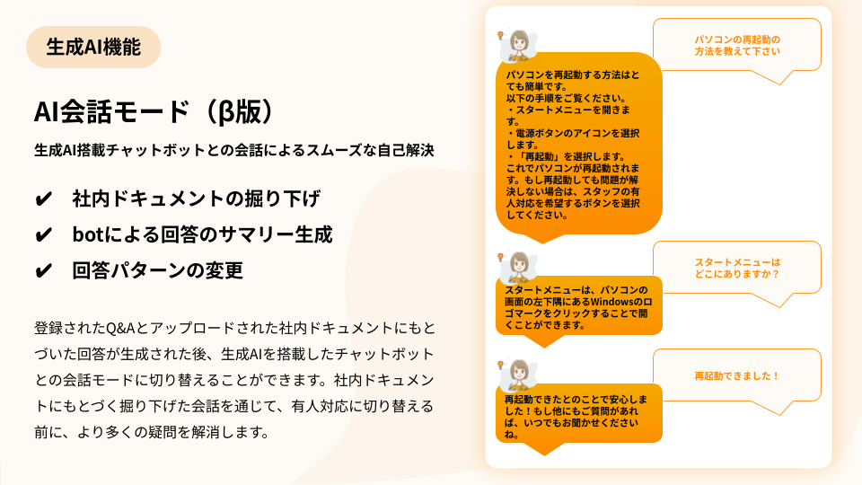 この度、社内ヘルプデスク・サービスデスクのさらなる負荷軽減に向け、従業員の自己解決率の向上を目的に、「helpmeee! KEIKO」において新たに「AI会話モード(β版)」が追加されました。これまでも相談内容に応じて適切な要約文章を生成することで、従業員の問い合わせに対して迅速かつ高精度な対応・サポートを実現してきました。「AI会話モード(β版)」では、AIとの会話を実現することでさらに体験価値を向上させ、スムーズな問題解決やナレッジ共有を重視する企業さまに対して大きなメリットをもたらすことが可能になりました。なお、「AI会話モード(β版)」は「helpmeee! KEIKO」をご利用中の全てのユーザーさまに無料でお使いいただけます。