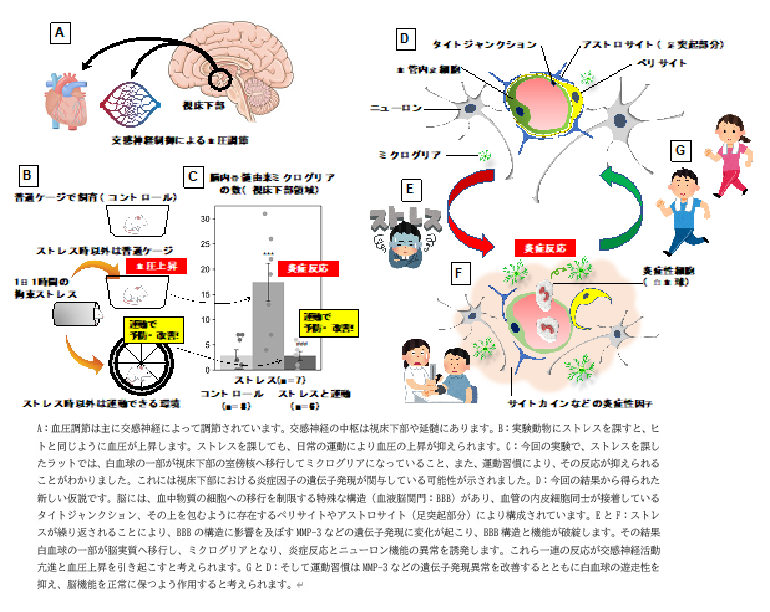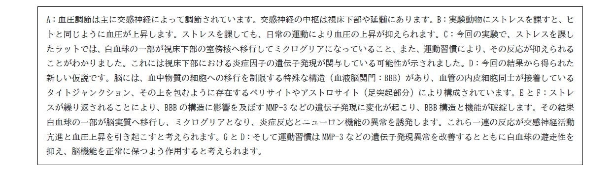 以上の結果から、運動習慣はストレスによる末梢(骨髄や血液)の炎症反応を改善することはありませんが、視床下部における炎症細胞の遊走性を抑制することで、PVNなどにおける炎症細胞の浸潤を抑制し、ストレス依存性高血圧を予防している可能性が示されました。