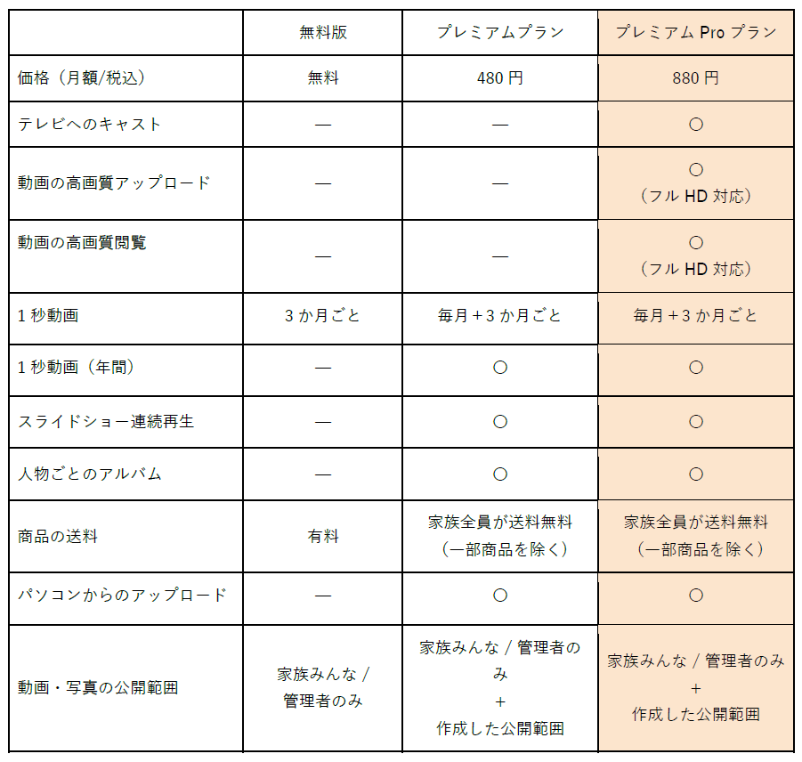 写真プリント商品を除き、「みてね」で購入できる商品(フォトブック、DVDなど)の送料が無料になります。家族のどなたかひとりが「プレミアムプラン」「プレミアムProプラン」に加入すると、アルバム内の家族全員が対象になります。