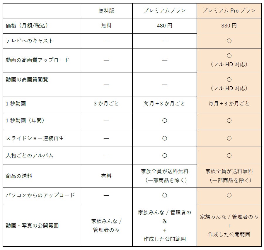「みてね」では無料版のほかに、最大10分までの動画のアップロードなどが可能な「プレミアムプラン」(480円・税込/月)と、プレミアムプラン全ての機能に加えて動画を高画質のフルハイビジョン画質でアップロードおよび閲覧が可能な「プレミアムProプラン」(880円・税込/月)の2つのプランを提供しています。