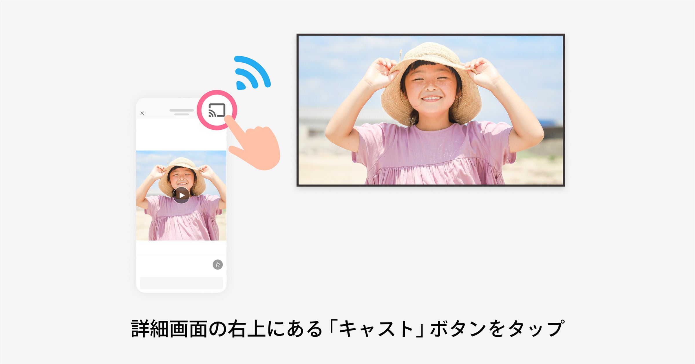 スマートフォンの「みてね」アプリを立ち上げ、上部の「Chromecast」ボタンを押すと投影完了。