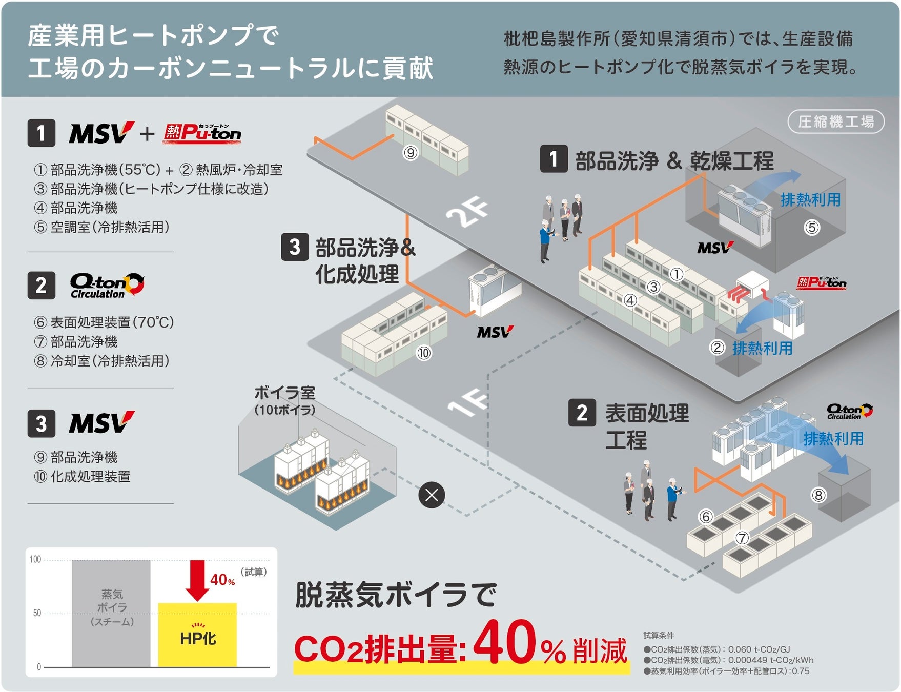 ※ 部品洗浄工程に60℃温水供給が可能な空冷ヒートポンプチラー「MSV」、表面処理工程に75℃温水を供給する循環加温ヒートポンプ「Q-ton Circulation」、乾燥工程に90℃温風を供給可能なヒートポンプ式熱風発生装置「熱Pu-ton」を適用しました。