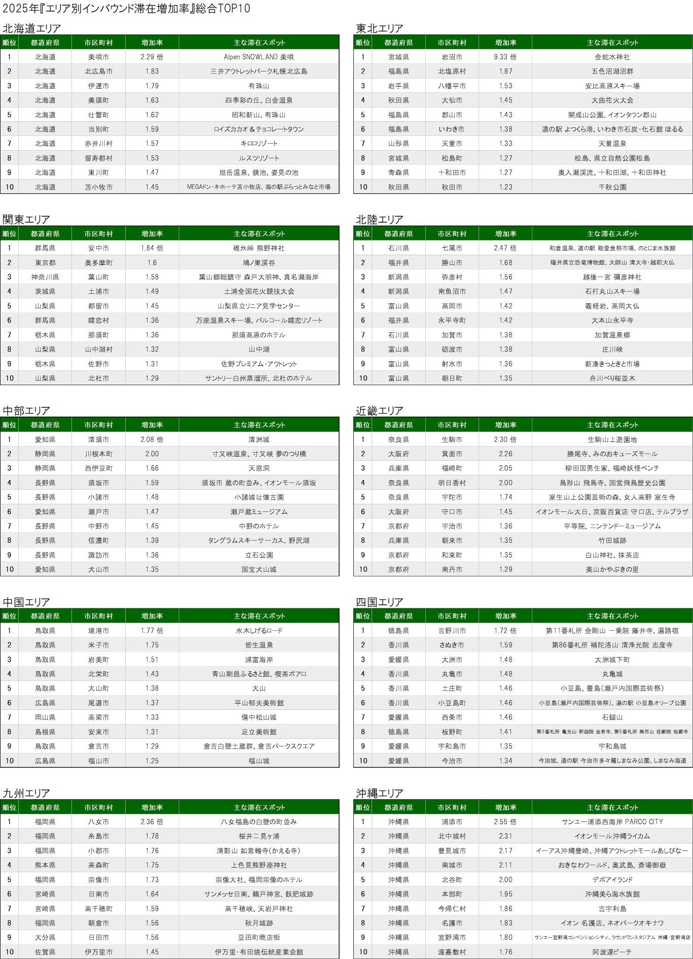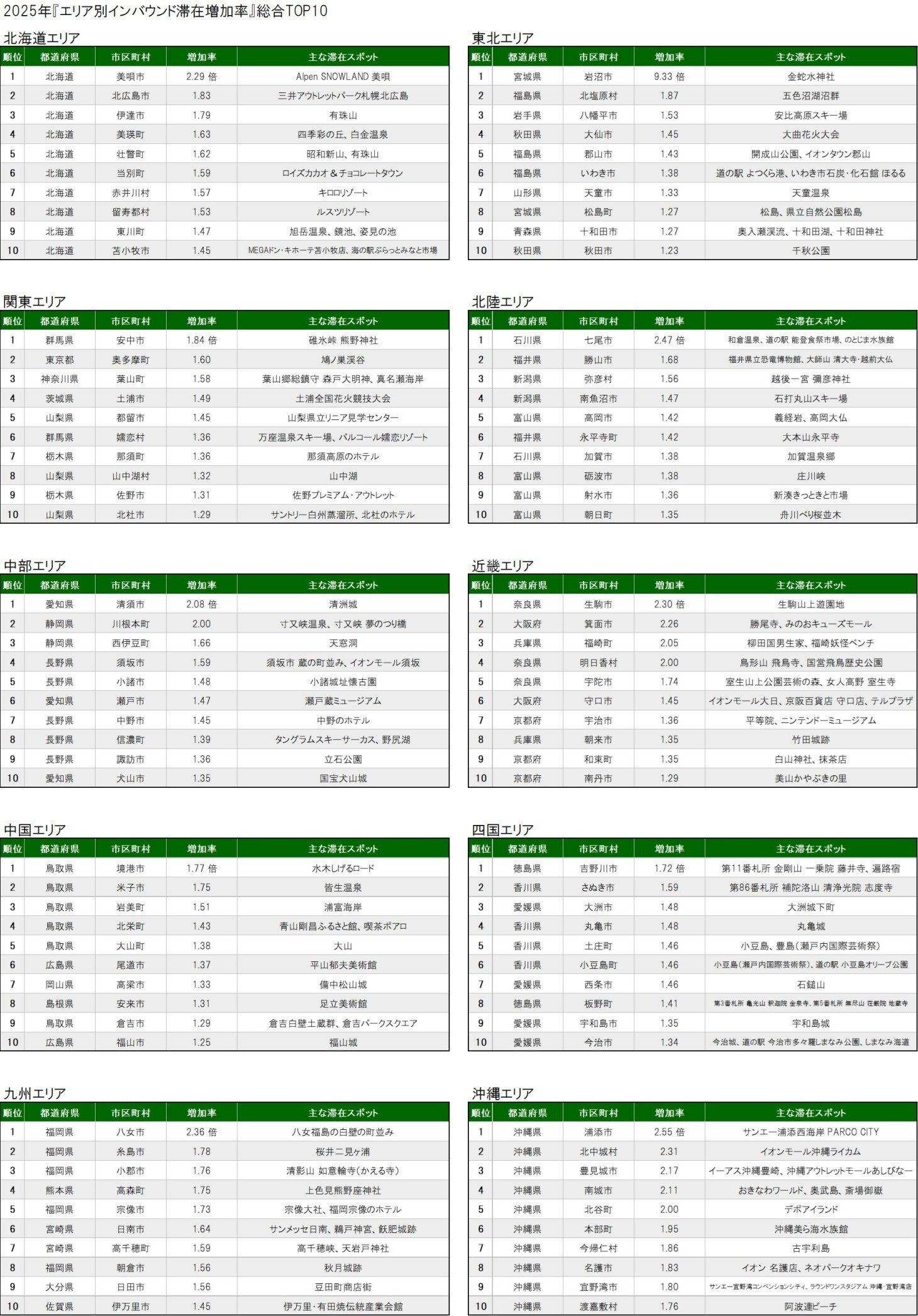 ■2025年エリア別インバウンド滞在増加率 1位まとめ