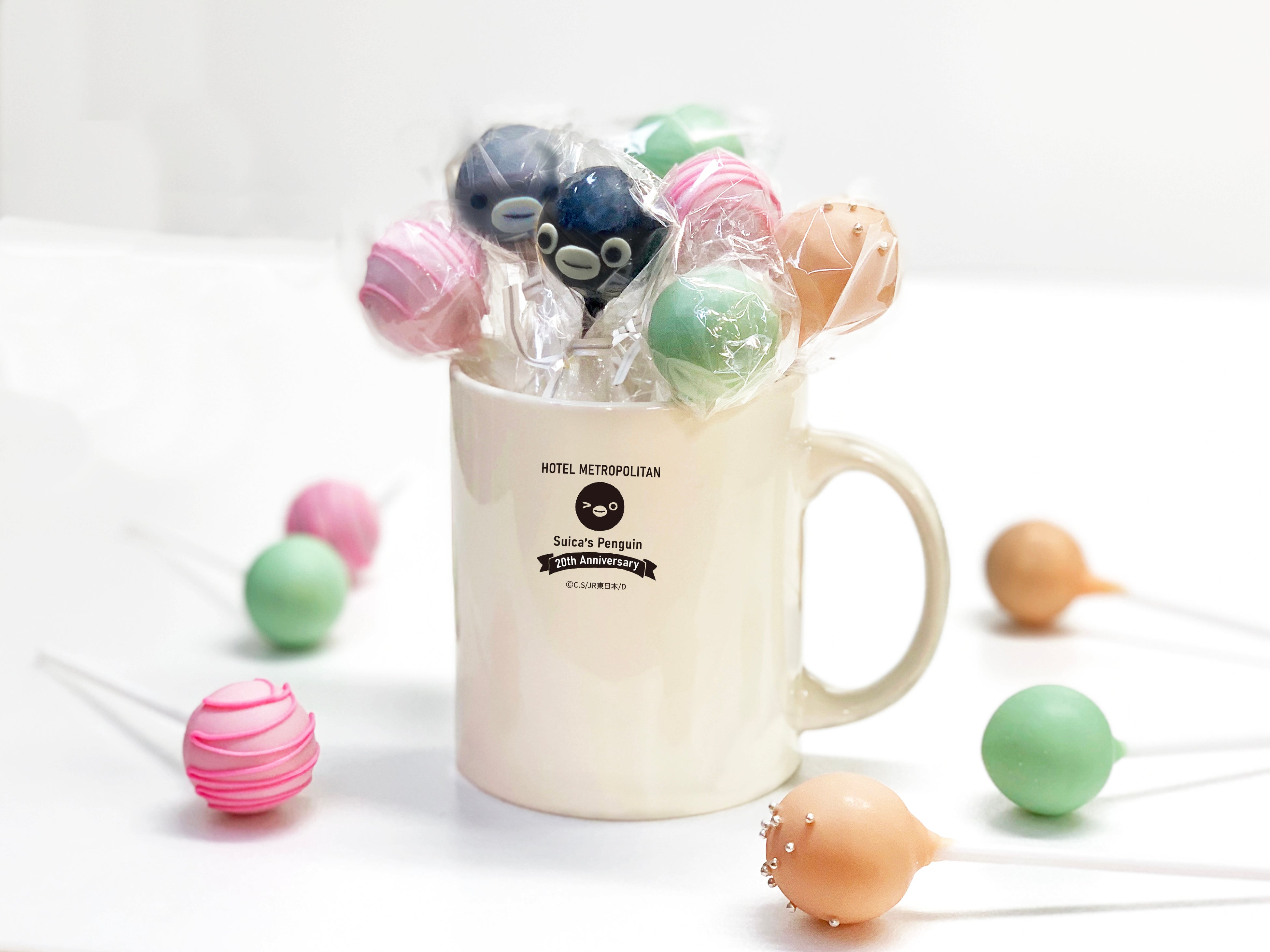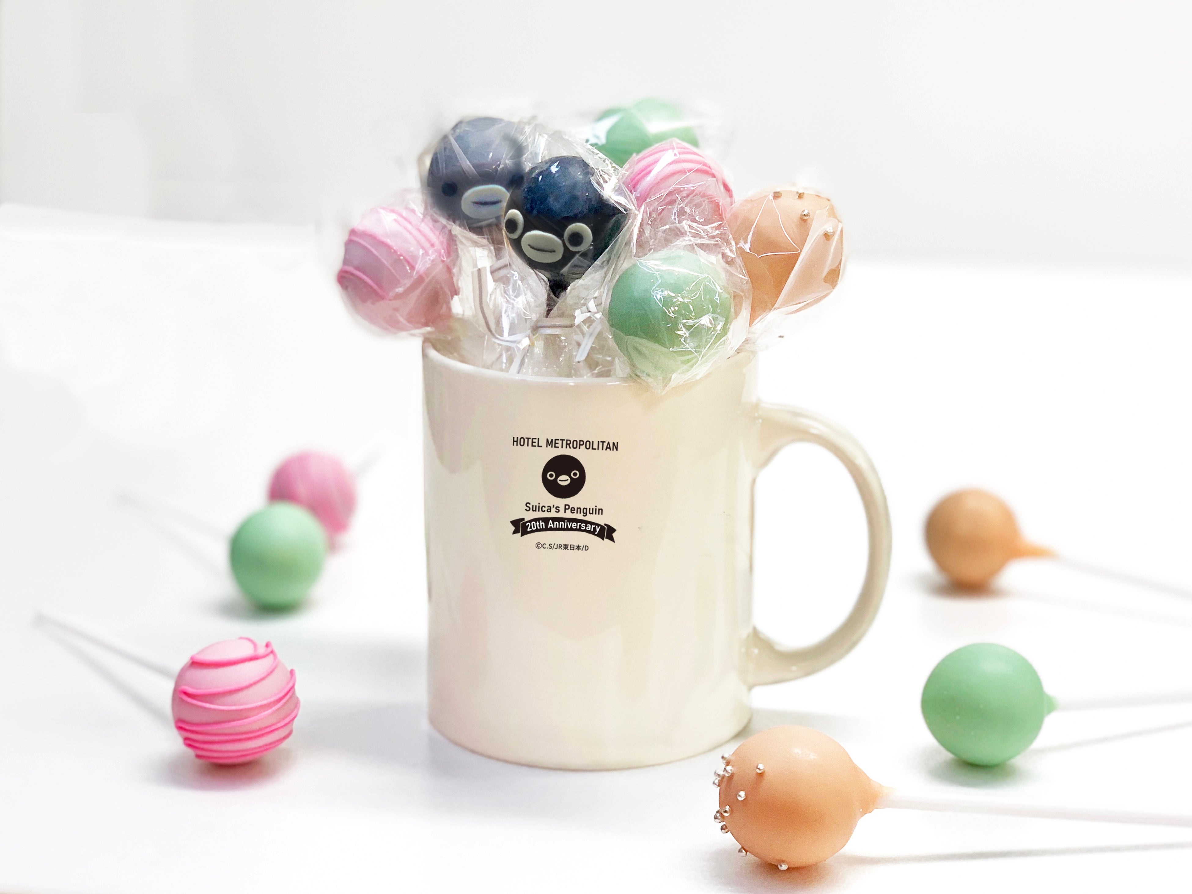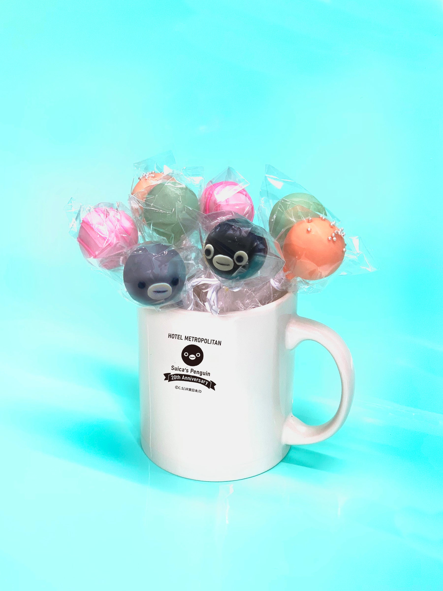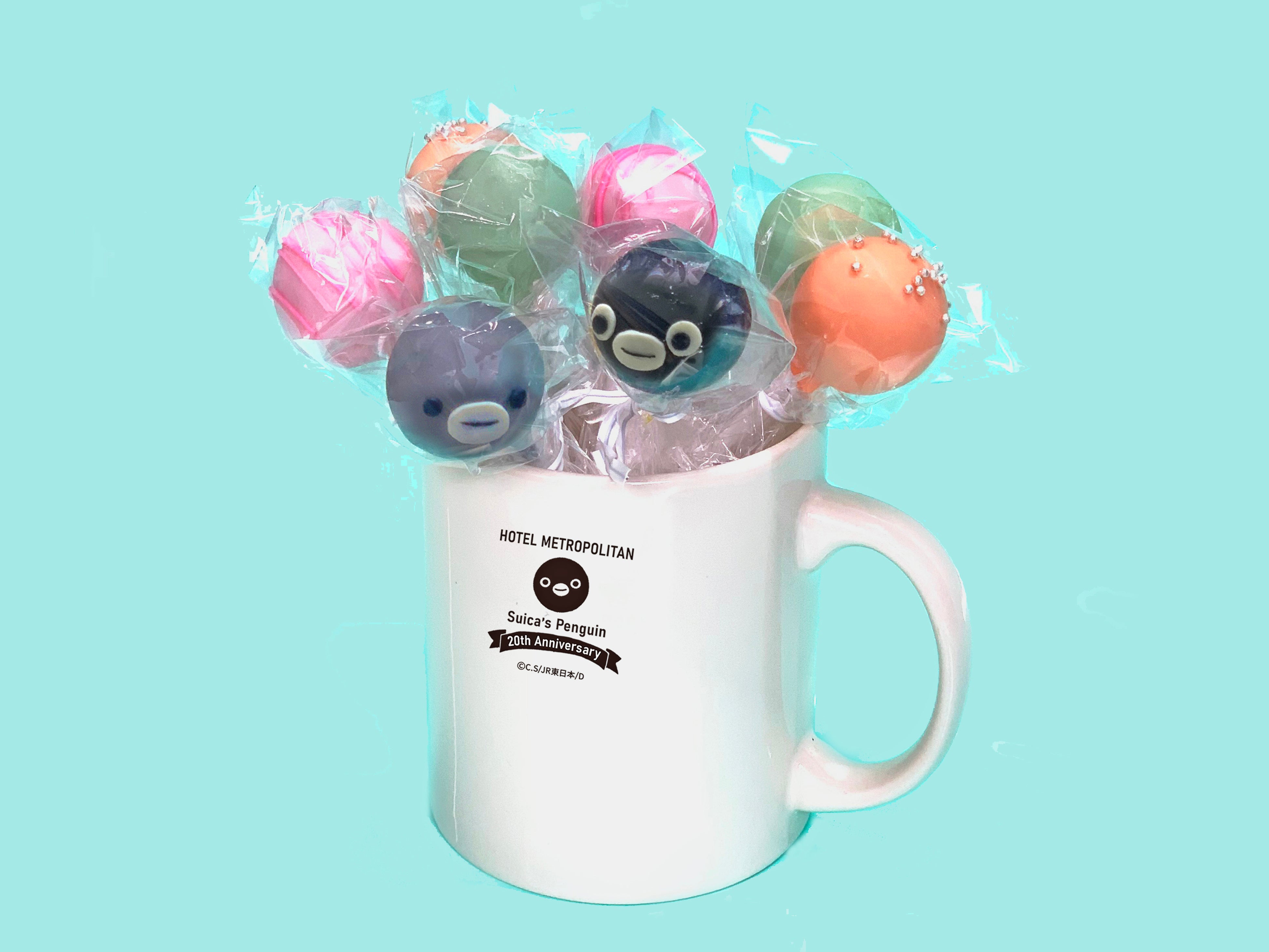 Suicaのペンギン20周年記念ホテルオリジナルデザインのかわいいマグカップにはプラリネガナッシュテイストのSuicaのペンギンと子ペンギン他、抹茶ガナッシュ2本、キャラメルガナッシュ2本、フレーズガナッシュ2本、合計8本入ったカラフルなチョコボンボンが登場。