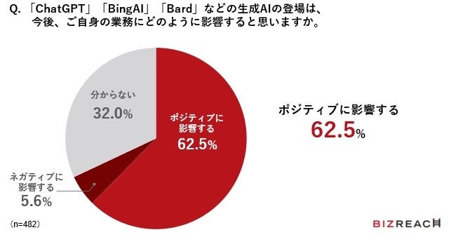 「ChatGPT」「BingAI」「Bard」などの生成AIの登場が、自身の業務にどのように影響するのか質問したところ、62.5%が「ポジティブに影響する」と回答しました。